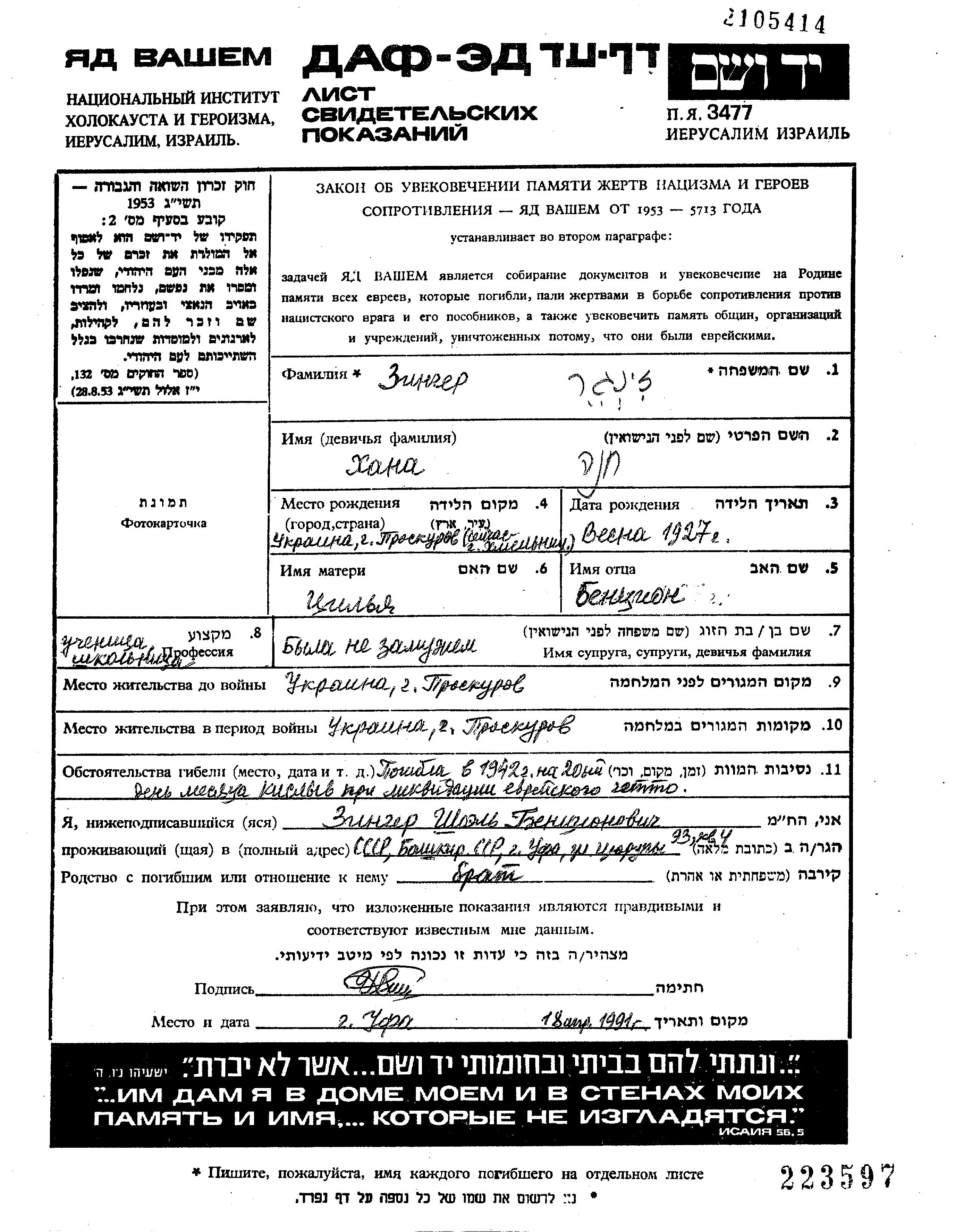 Зингер Хана 1927 Проскуров, Украина (СССР) Лист свидетельских показаний