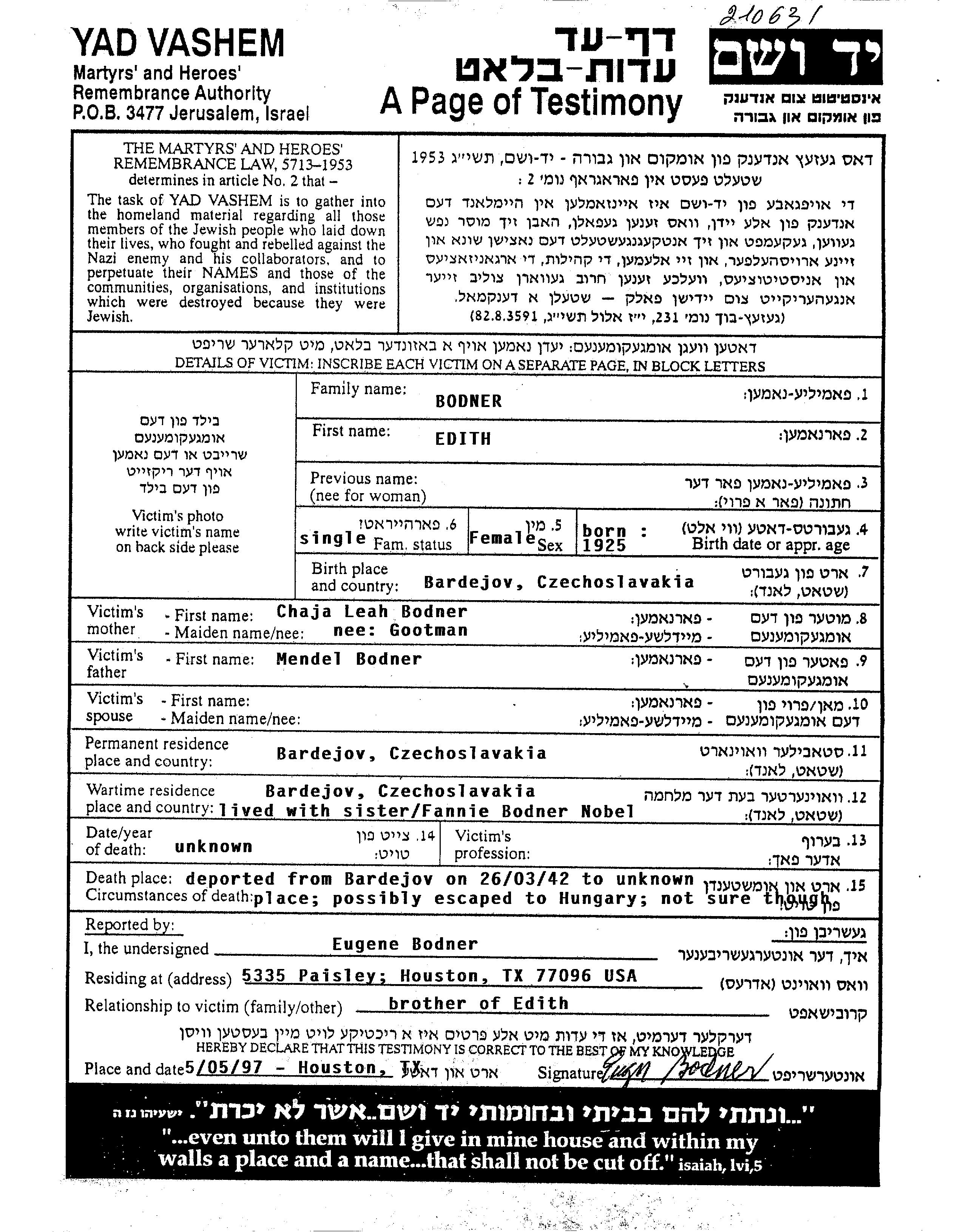 Эдит Боднер, место рождения: Бардеёв, Чехословакия. Отец: Мендель, mать:Хая Лея, девичья фамилия Готман Гутман. Холост / не замужем. Место жительства до войны: Бардеёв, Чехословакия. Место во время войны: Бардеёв, Чехословакия.