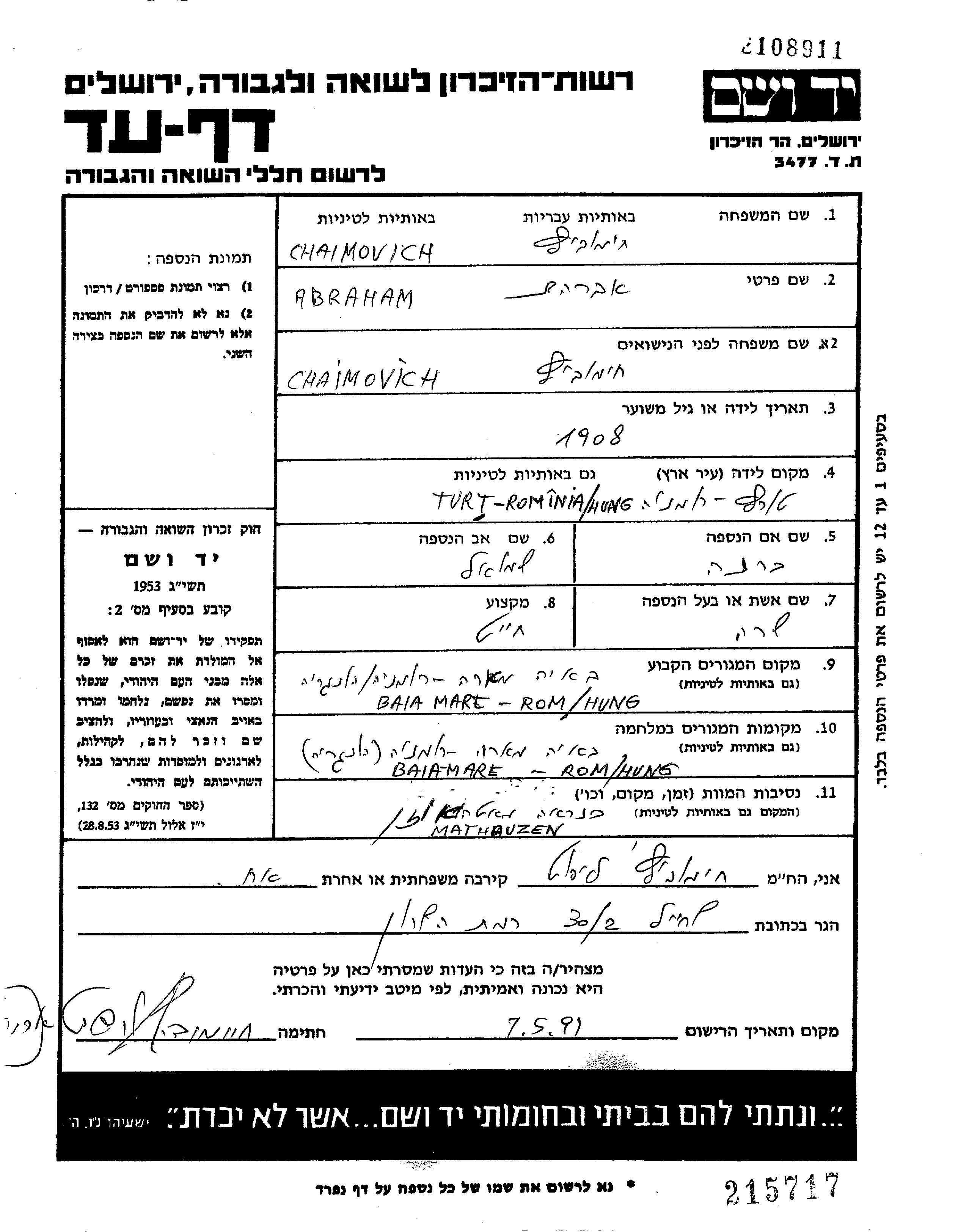 Хаимович Абраам 1908 Бая-Маре, Румыния Лист свидетельских показаний