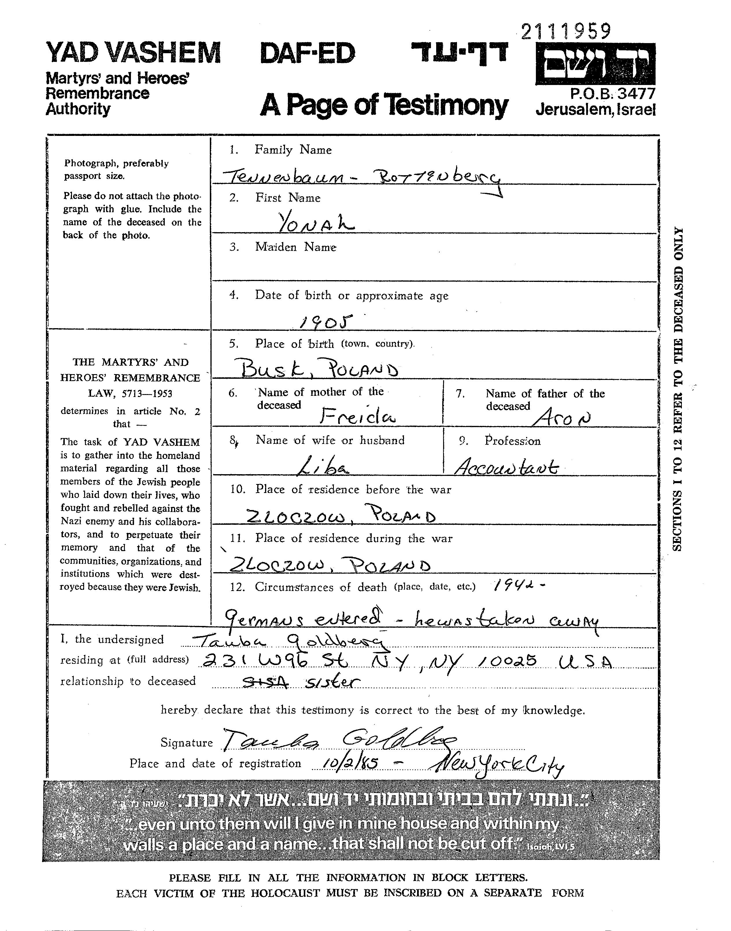 Иона Тенненбаум Рутенберг, место рождения: Буск, Польша. Отец: Арон, mать:Фрейда, девичья фамилия Роттенберг. Бухгалтер / счетовод. Женат / замужем. Место жительства до войны: Злочев, Польша. Место во время войны: Злочев, Польша.