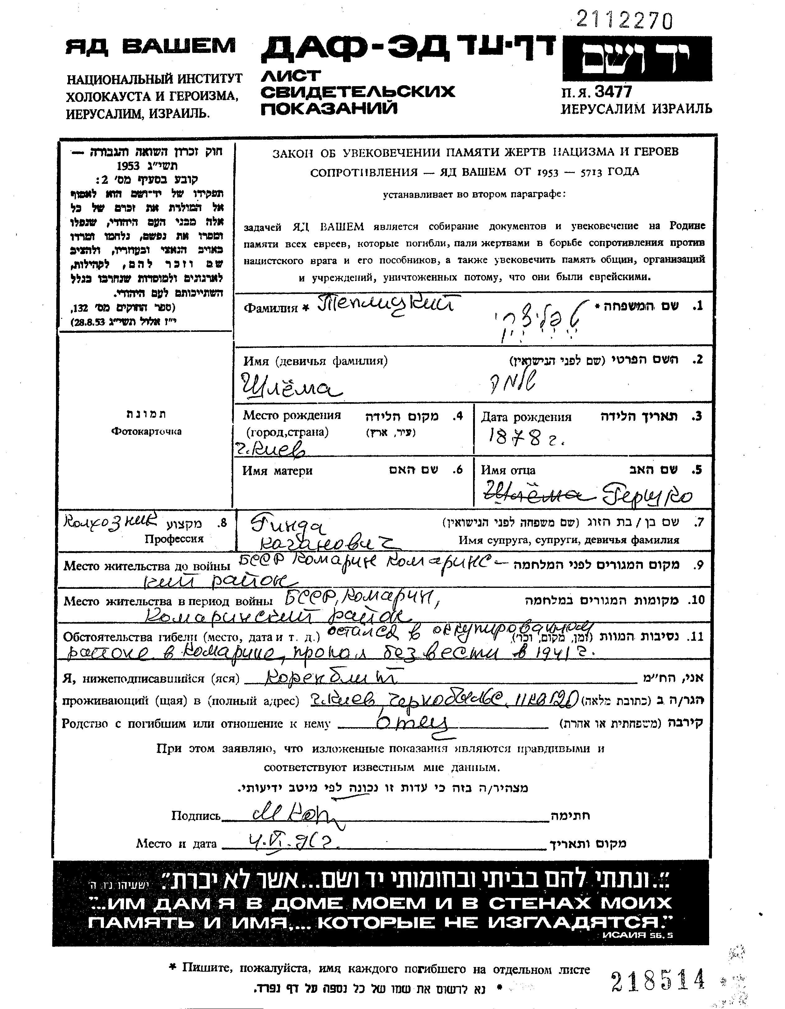 Теплицкий Шлёма 1878 Комарин, Белоруссия (СССР) Лист свидетельских показаний