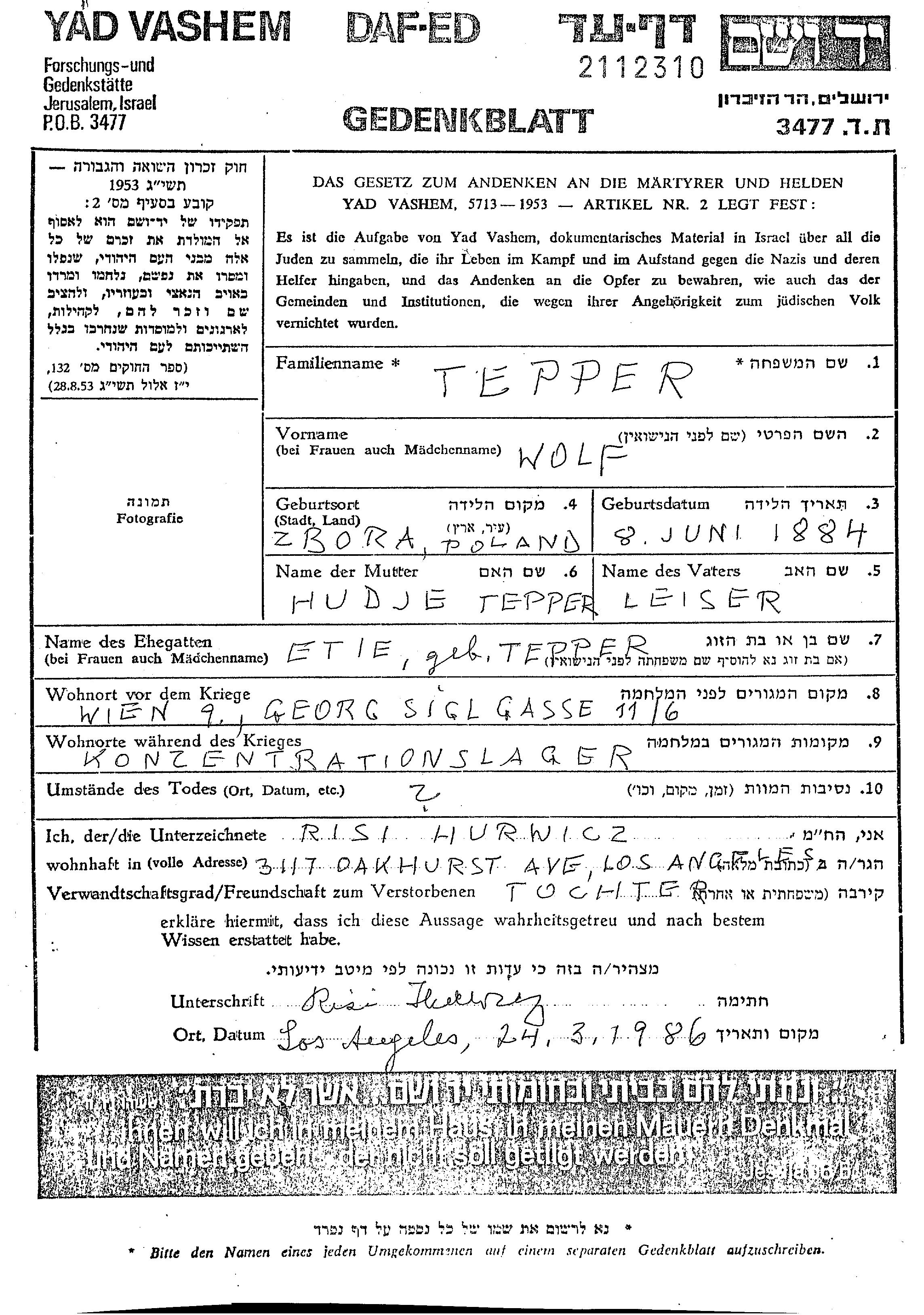 Вольф Теппер, место рождения: Збора, Польша. Отец: Лейзер, mать:Худье Хода. Женат / замужем. Место жительства до войны: Вена, Австрия.