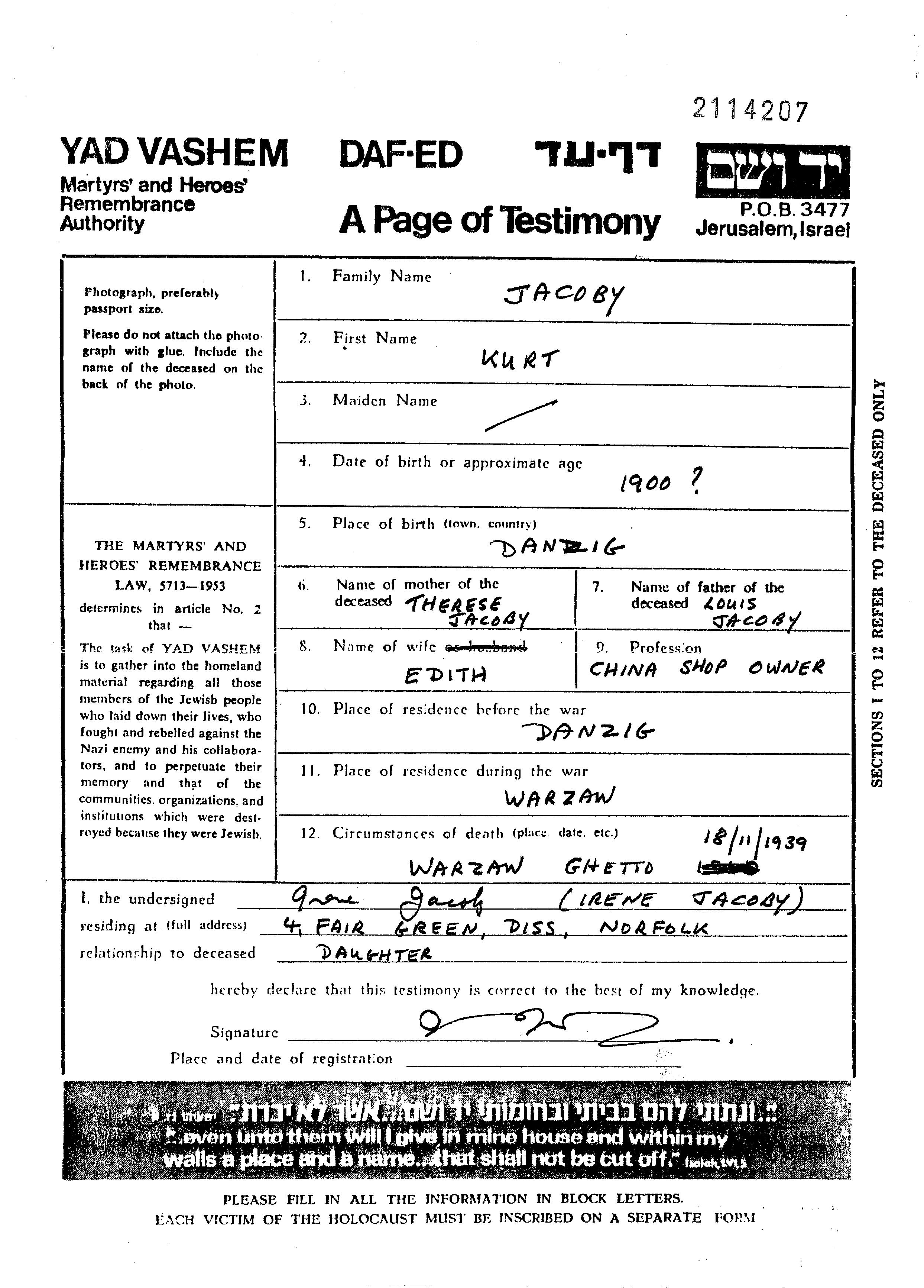 Курт Якоби, место рождения: Данциг, Данциг. Отец: Луис, mать:Терезе. Владелец / владелица магазина. Женат / замужем. Место жительства до войны: Данциг, Данциг. Место во время войны: Варшава, Польша.