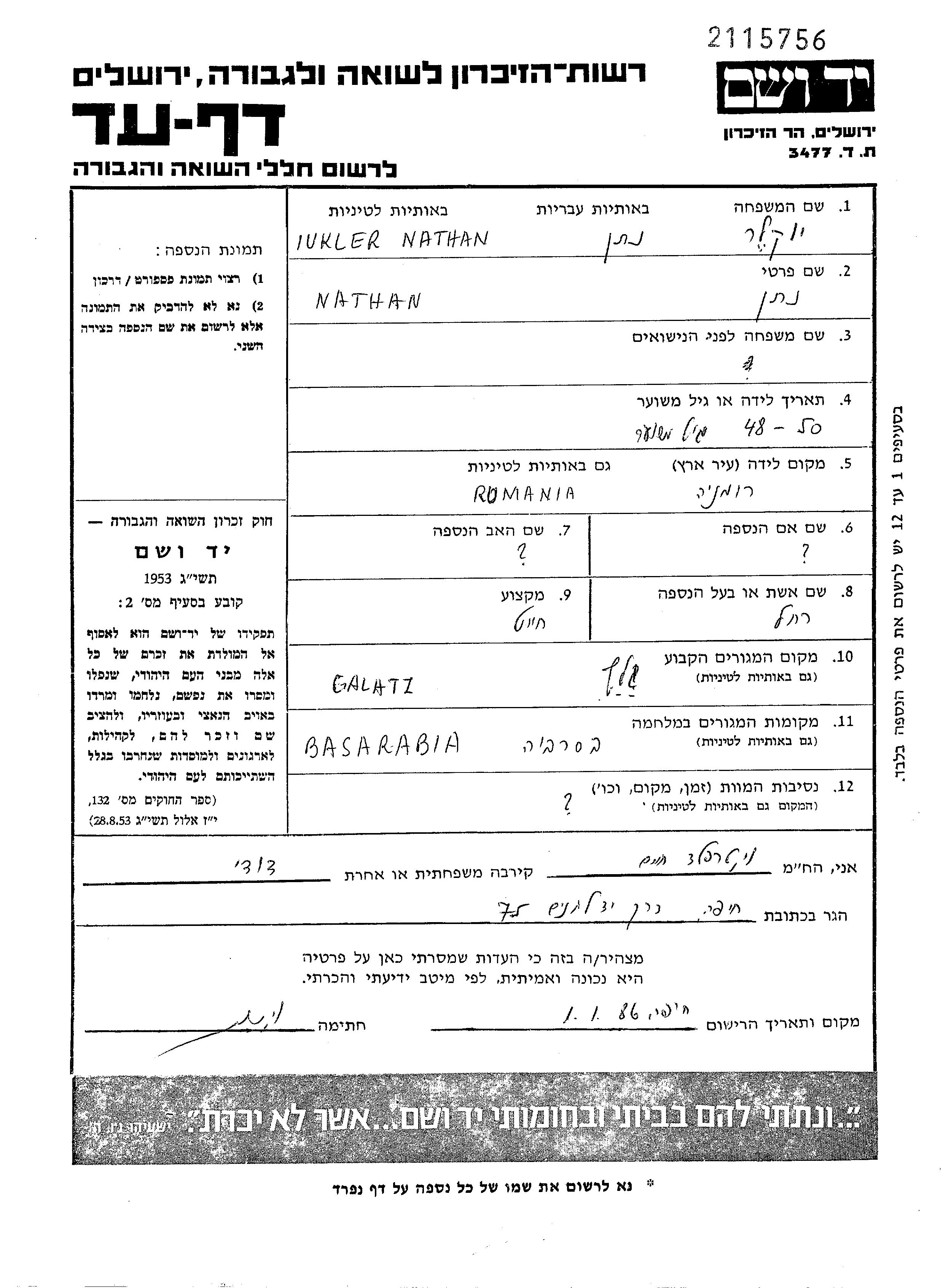 Натан Юклер, место рождения: Румыния. Портной / портниха. Женат / замужем. Место жительства до войны: Галац, Румыния. Место во время войны: Бессарабия, Румыния.