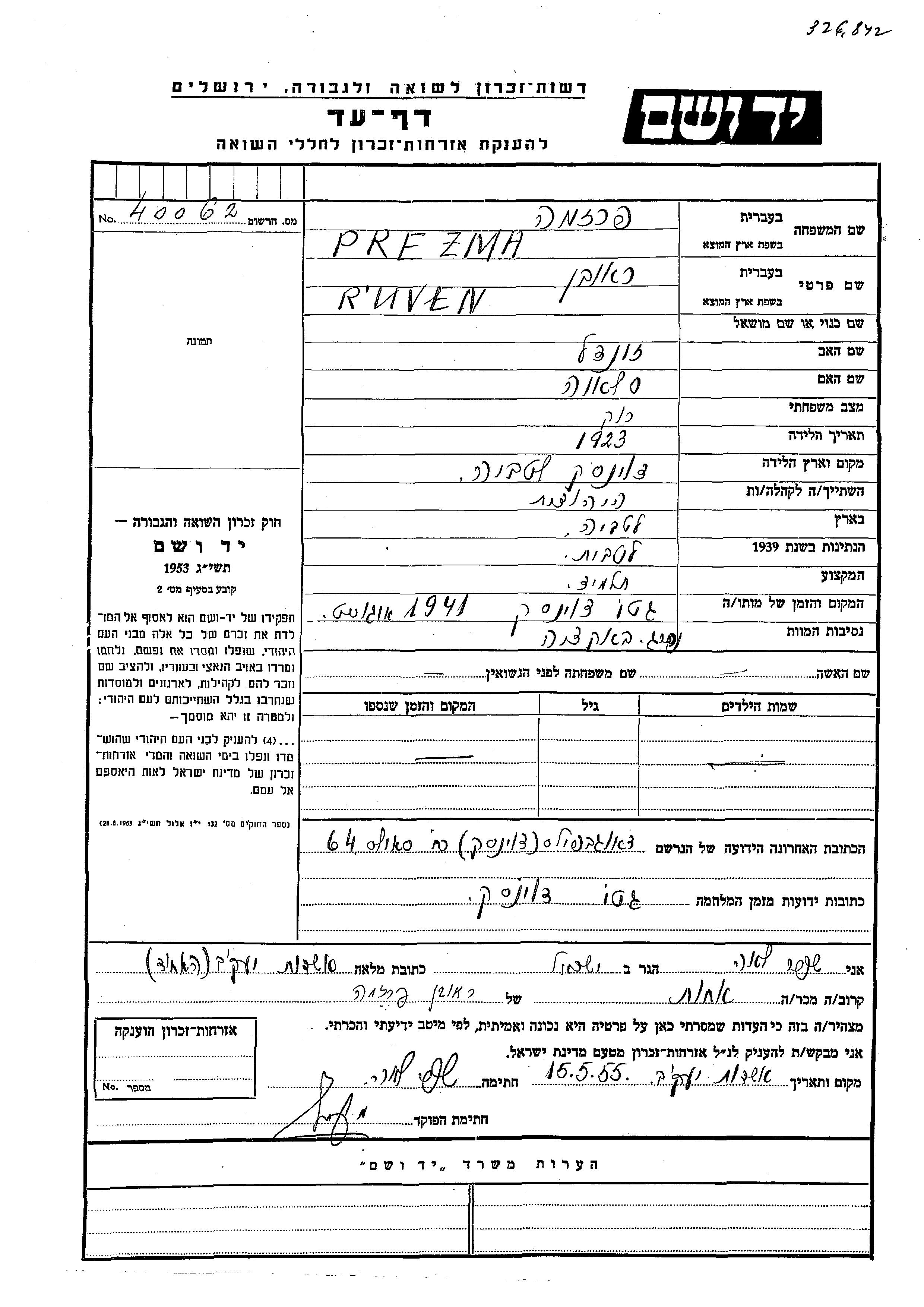 Презма Рувен 1923 Двинск, Латвия Лист свидетельских показаний