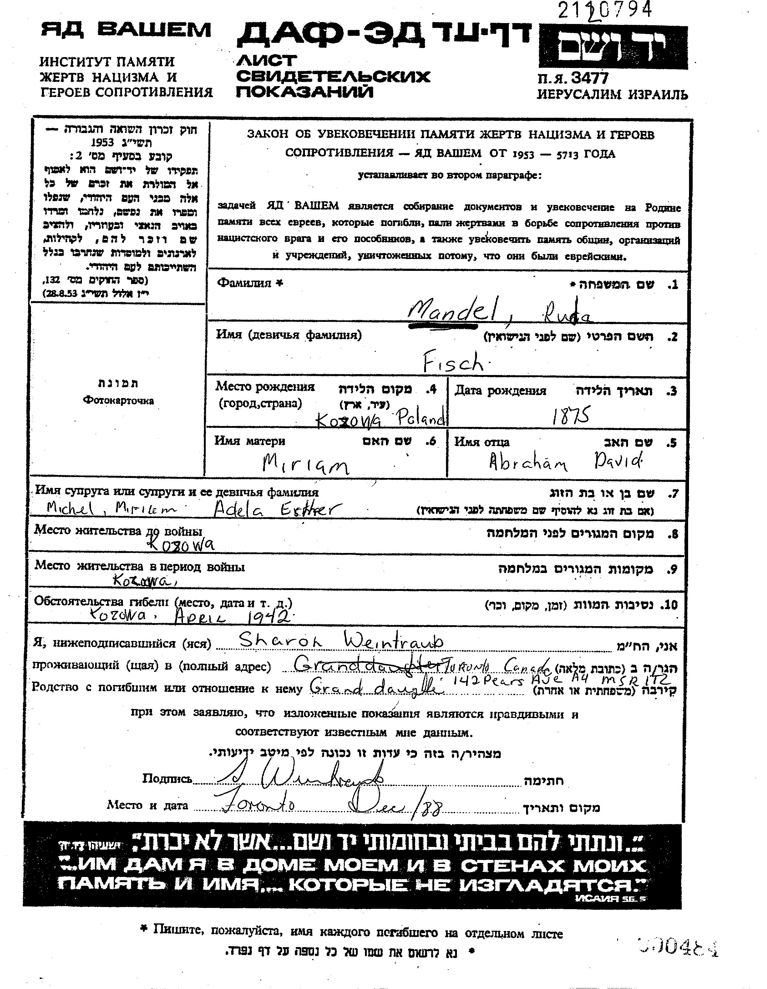 Мандель Рода 1875 Козова, Польша Лист свидетельских показаний