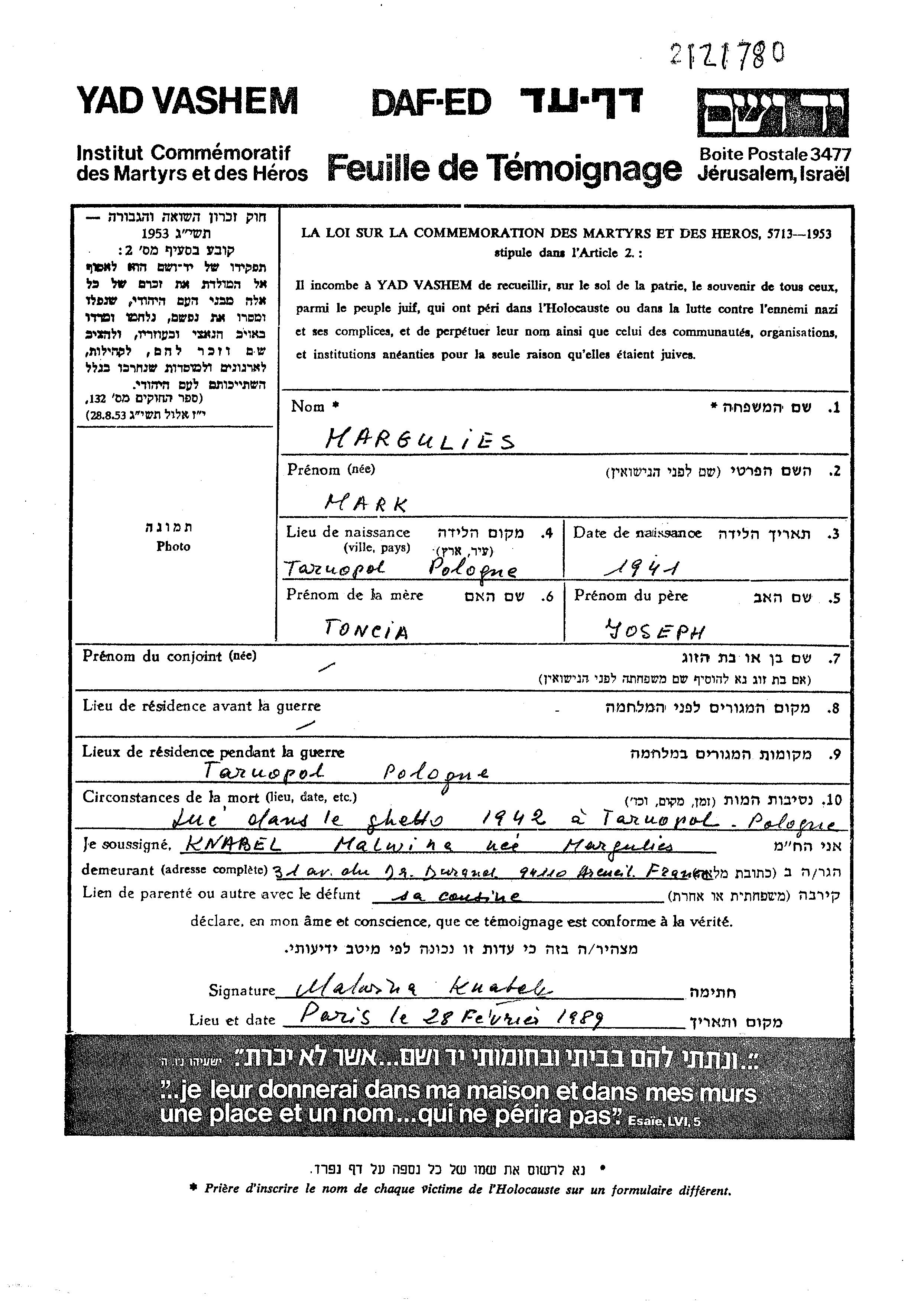 Маргулес Марк 1941 Тарнополь, Польша Лист свидетельских показаний