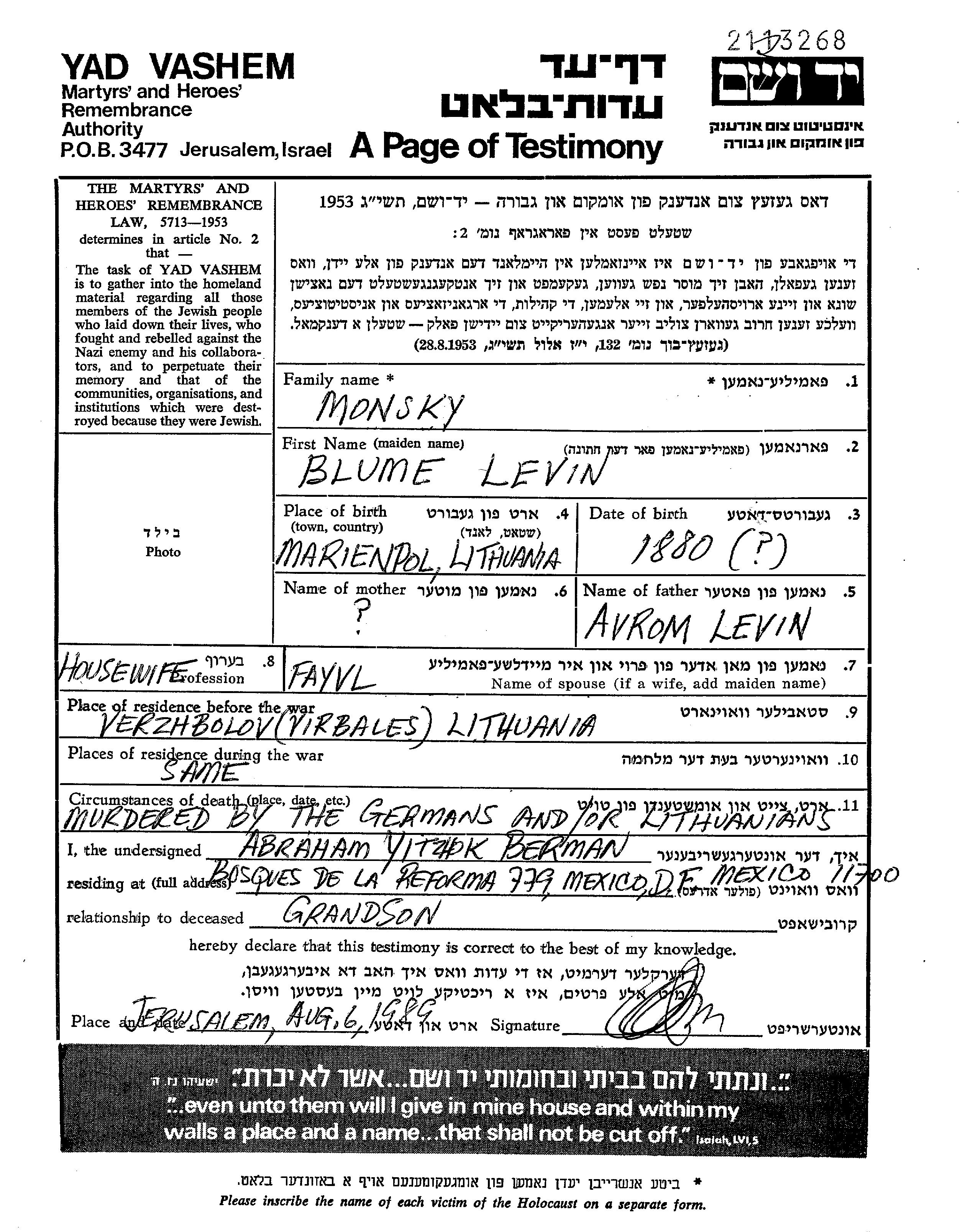 Блюма Монски, девичья фамилия Левин, место рождения: Мариямполе, Литва. Отец: Авром. Домохозяйка. Женат / замужем. Место жительства до войны: Вирбалис, Литва. Место во время войны: Вирбалис, Литва.