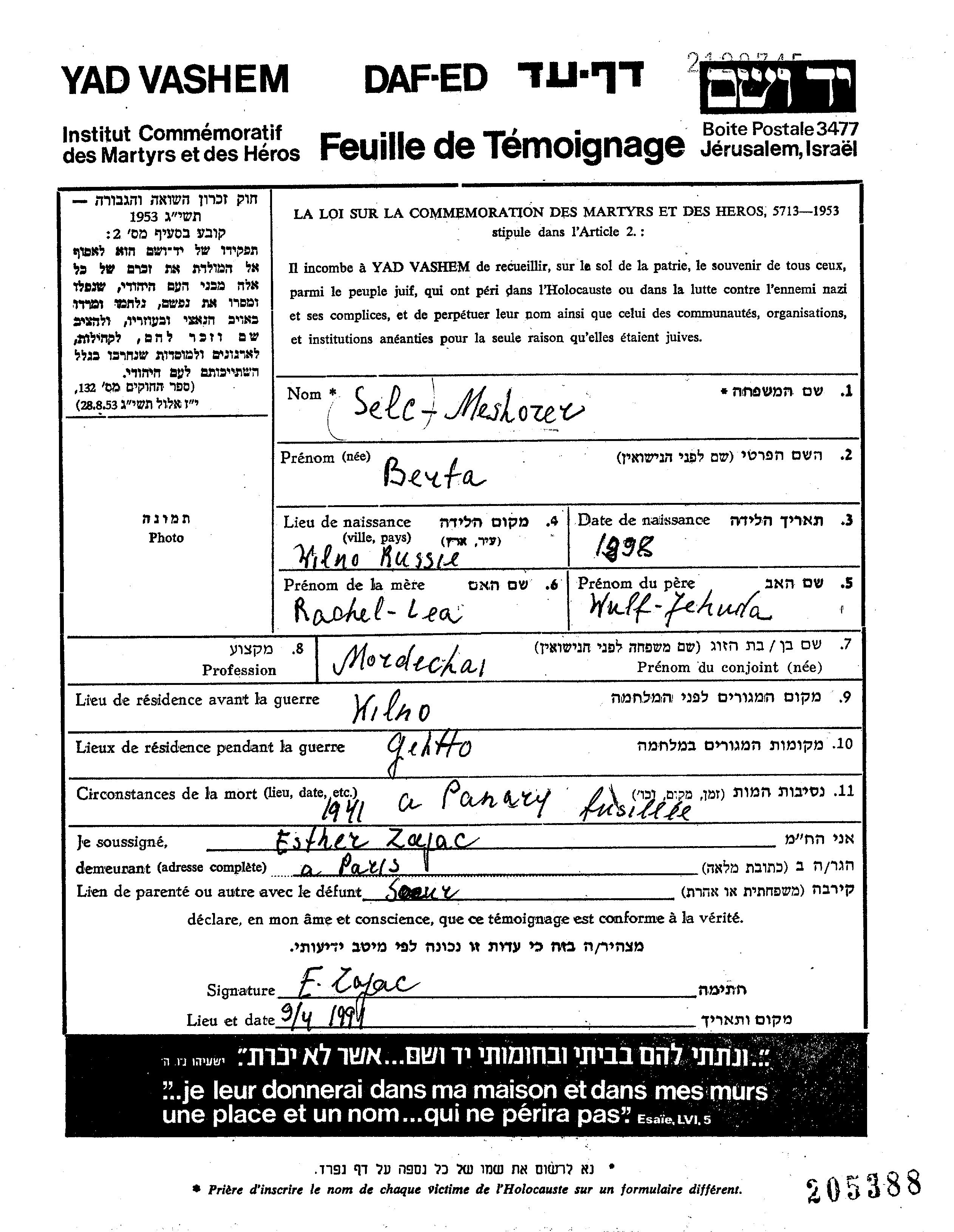 Берта Мешорер, девичья фамилия Сельц, место рождения: Вильно, Польша. Отец: Вульф Егуда, mать:Рахель Лея. Женат / замужем. Место жительства до войны: Вильно, Польша. Место во время войны: Вильно, Польша.