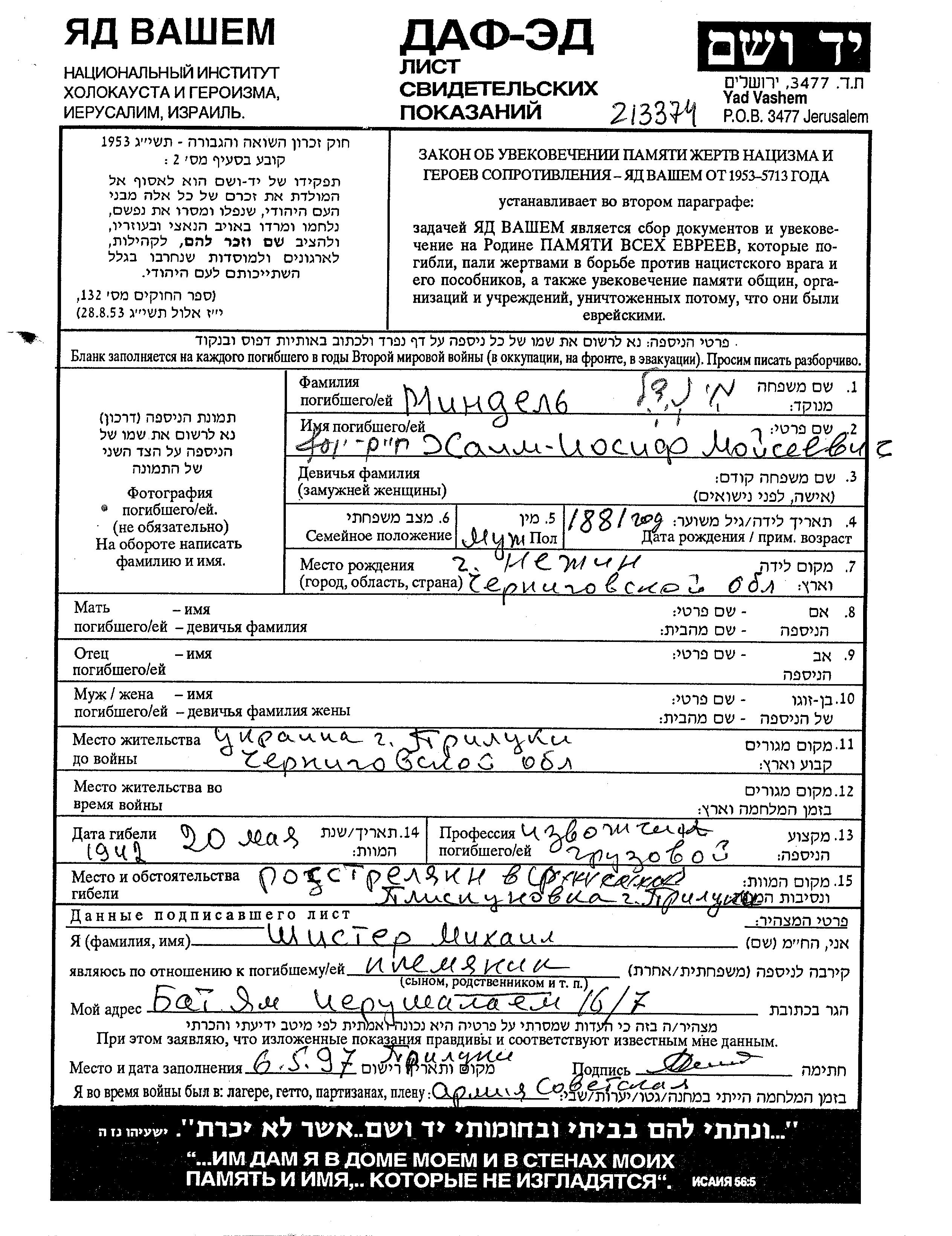 Миндель Иосиф Хаим 1881 Прилуки, Украина (СССР) Лист свидетельских показаний