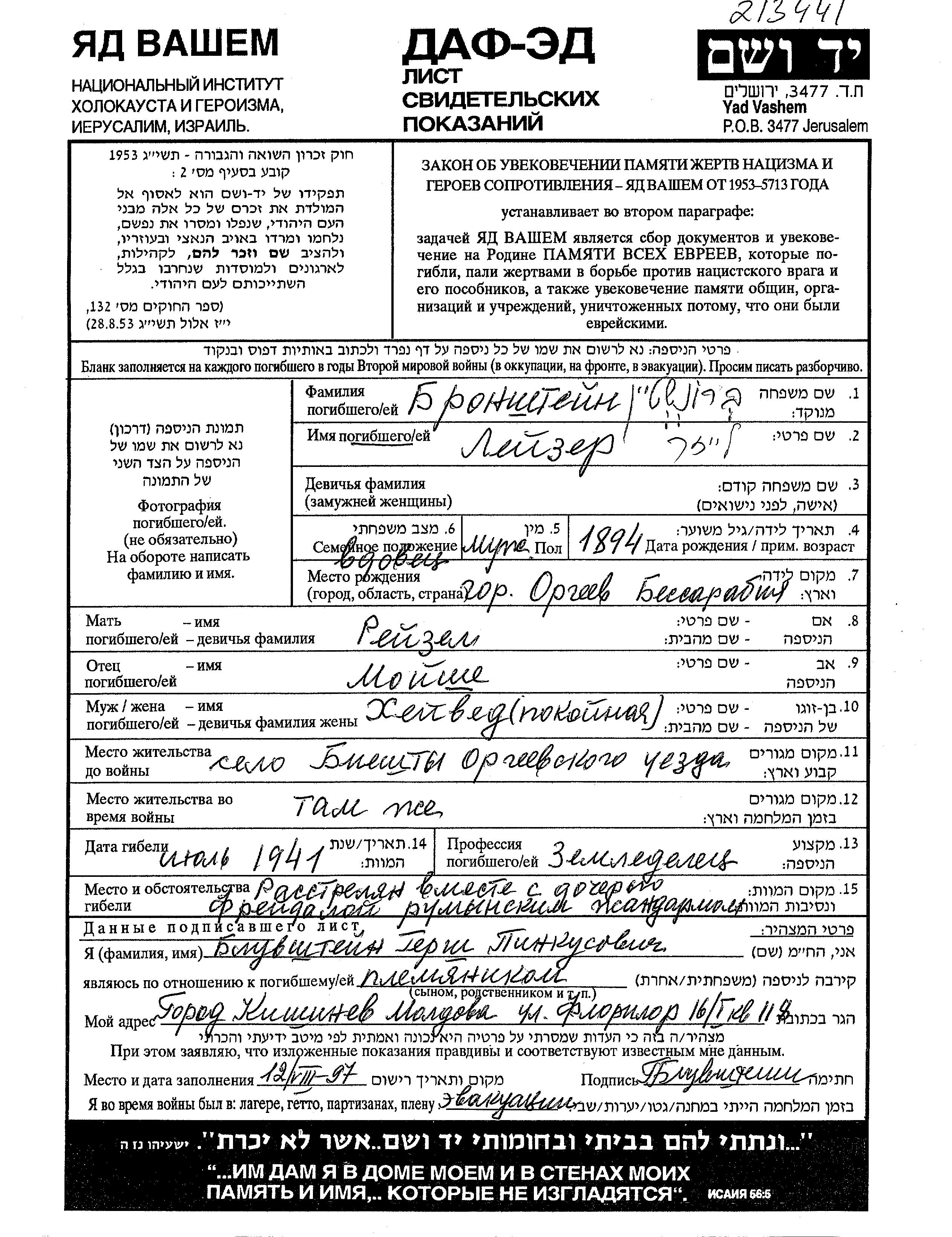 Лейзер Бронштейн, место рождения: Орхей, Румыния. Отец: Мойше, mать:Рейзл. Земледелец / земледелица. Вдовец / вдова. Место жительства до войны: Бешты, Румыния. Место во время войны: Бешты, Румыния.