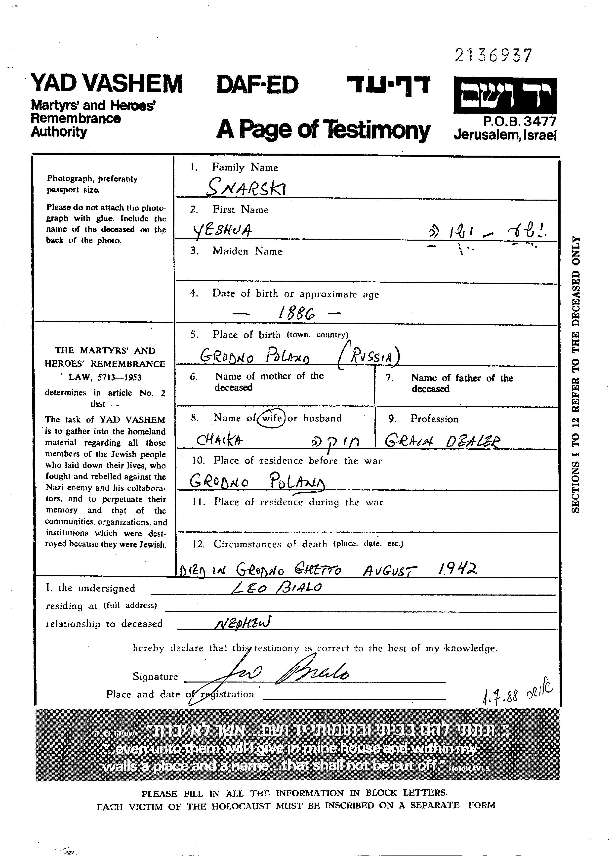 Снарски Ешуа Гродно, Польша Лист свидетельских показаний