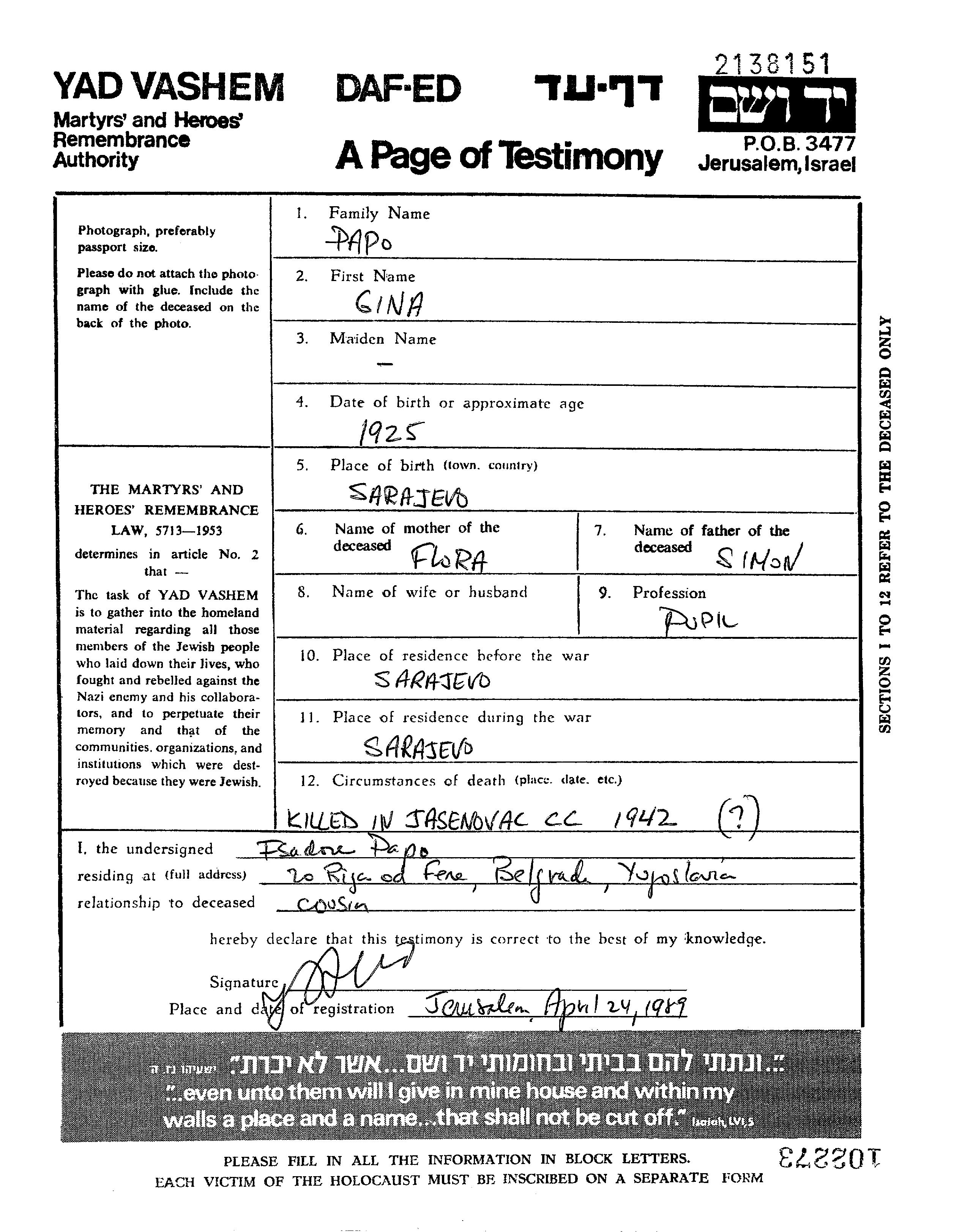 Папо Гина Сараево, Югославия Лист свидетельских показаний
