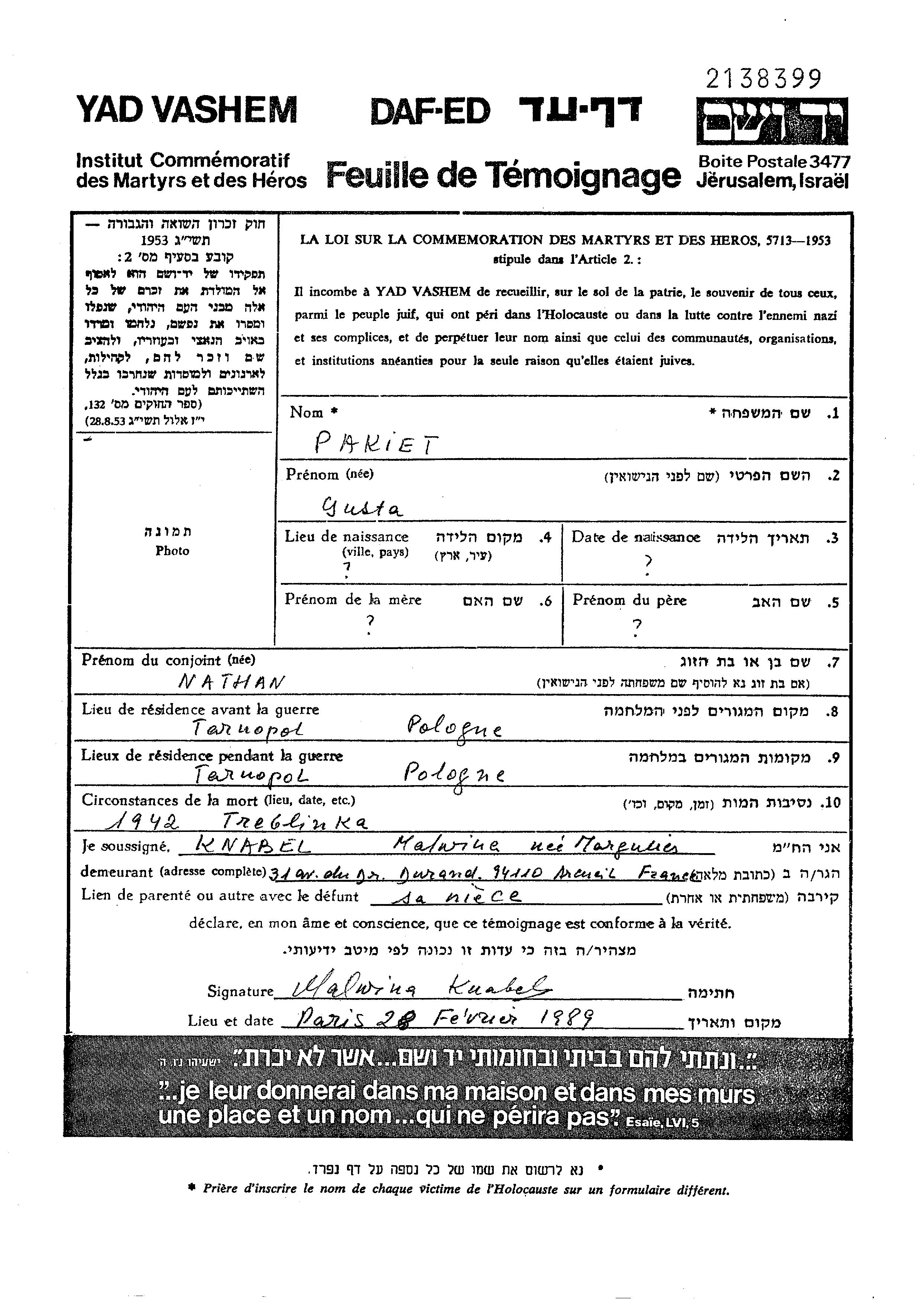 Густа Пакет. Женат / замужем. Место жительства до войны: Тарнополь, Польша. Место во время войны: Тарнополь, Польша.