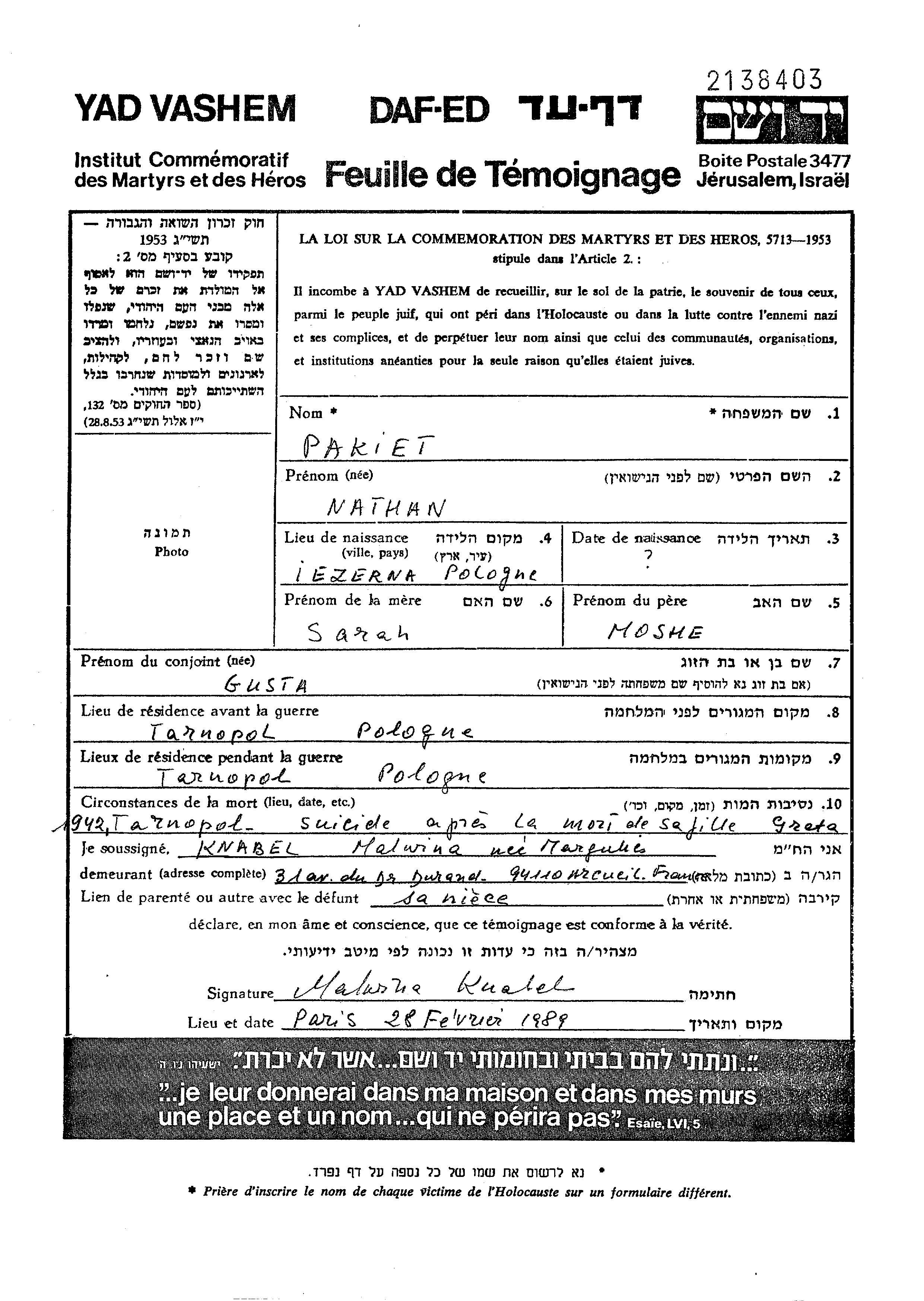 Натан Пакет, место рождения: Езерна, Польша. Отец: Моше, mать:Сара. Женат / замужем. Место жительства до войны: Тарнополь, Польша. Место во время войны: Тарнополь, Польша.