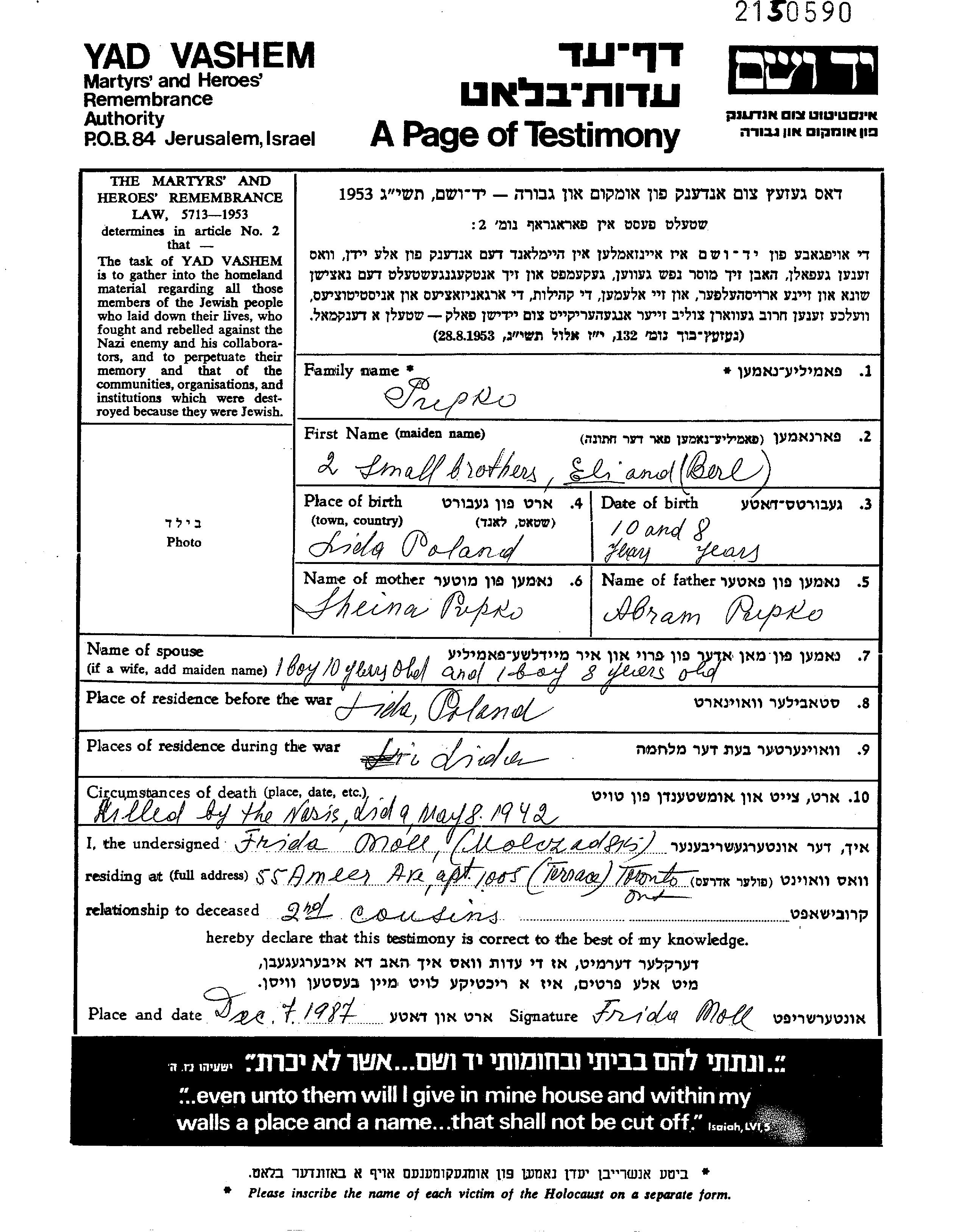 Эли Пупко Попко, место рождения: Лида, Польша. Отец: Абрам, mать:Шейна, девичья фамилия Мирская. Ребенок. Место жительства до войны: Лида, Польша. Место во время войны: Лида, Польша.
