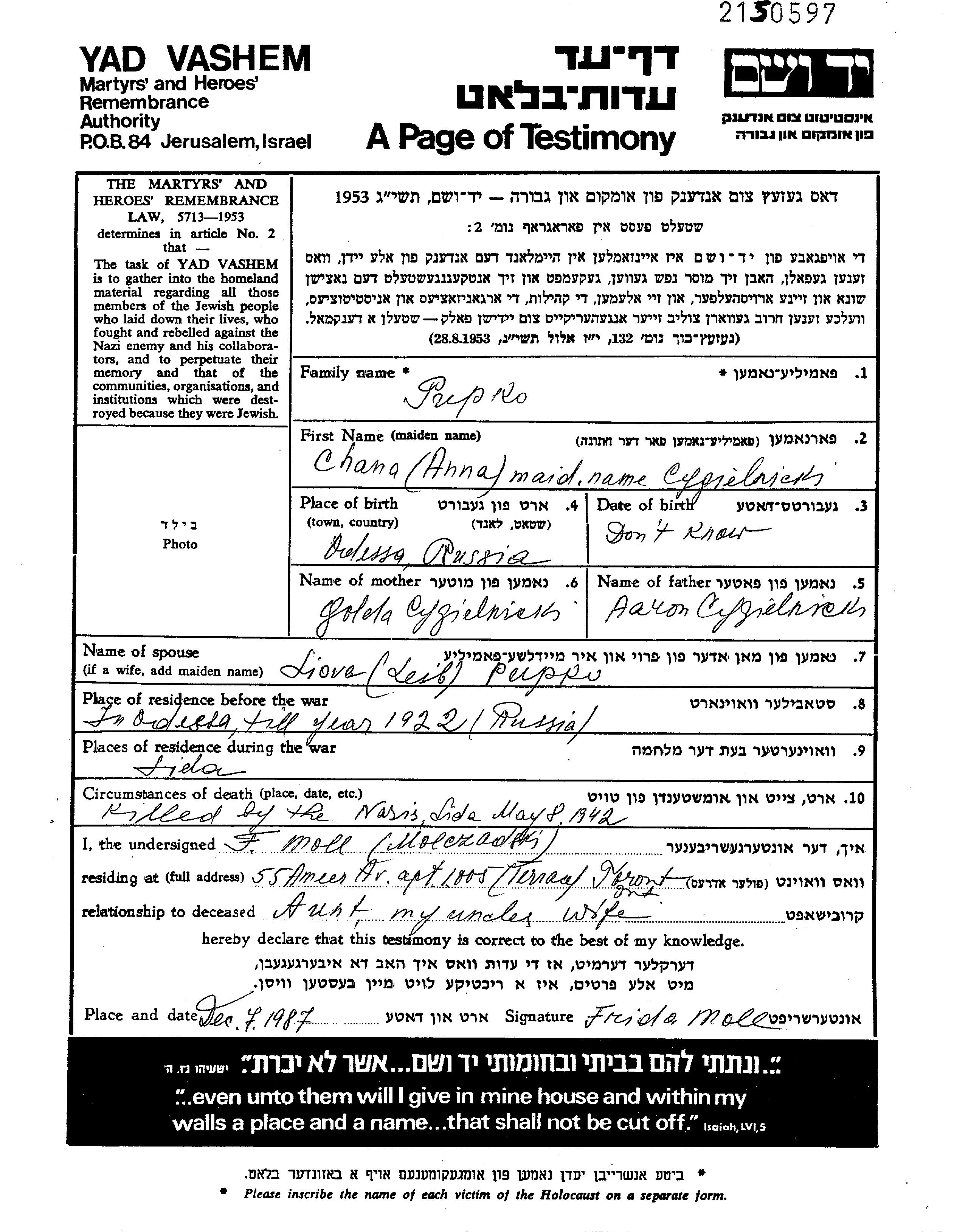 Пупко Попко Хана Анна Одесса, Украина (СССР) Лист свидетельских показаний