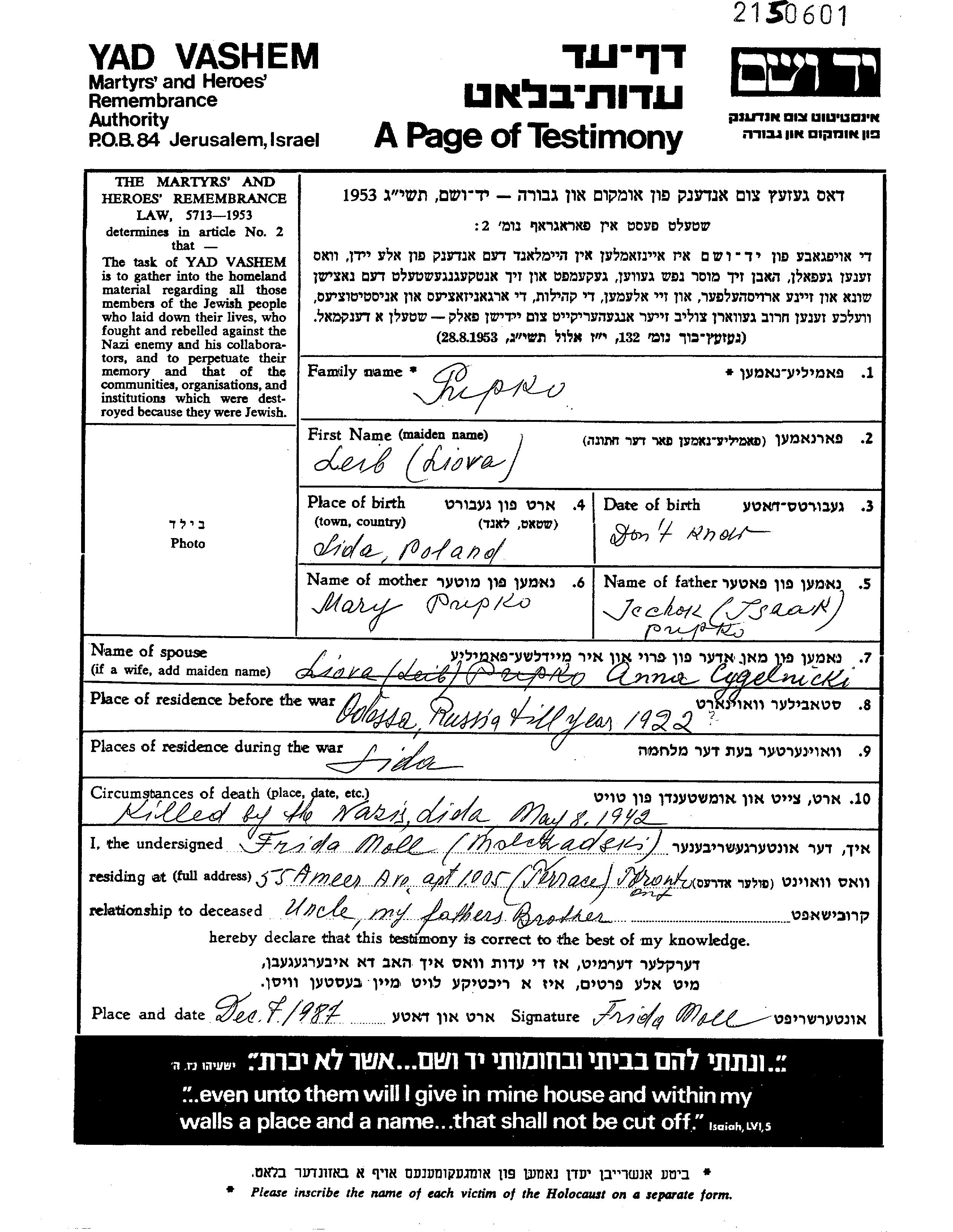 Лёва Лейб Пупко Попко, место рождения: Лида, Польша. Отец: Ицхок, mать:Мери. Женат / замужем. Место жительства до войны: Одесса, Украина (СССР). Место во время войны: Лида, Польша.