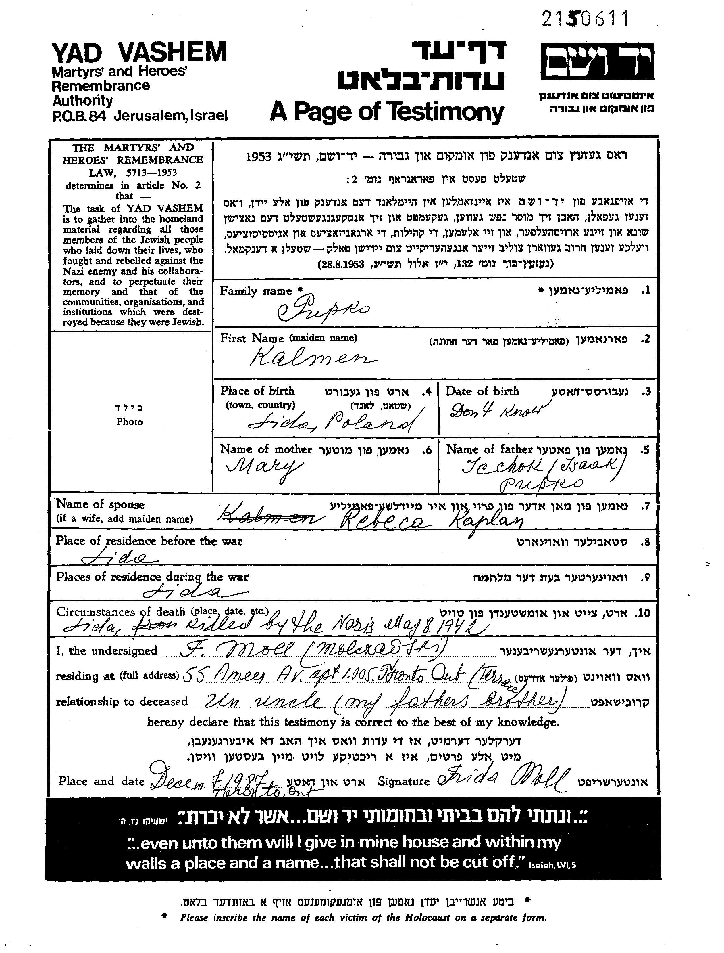 Пупко Попко Кальмен Лида, Польша Лист свидетельских показаний