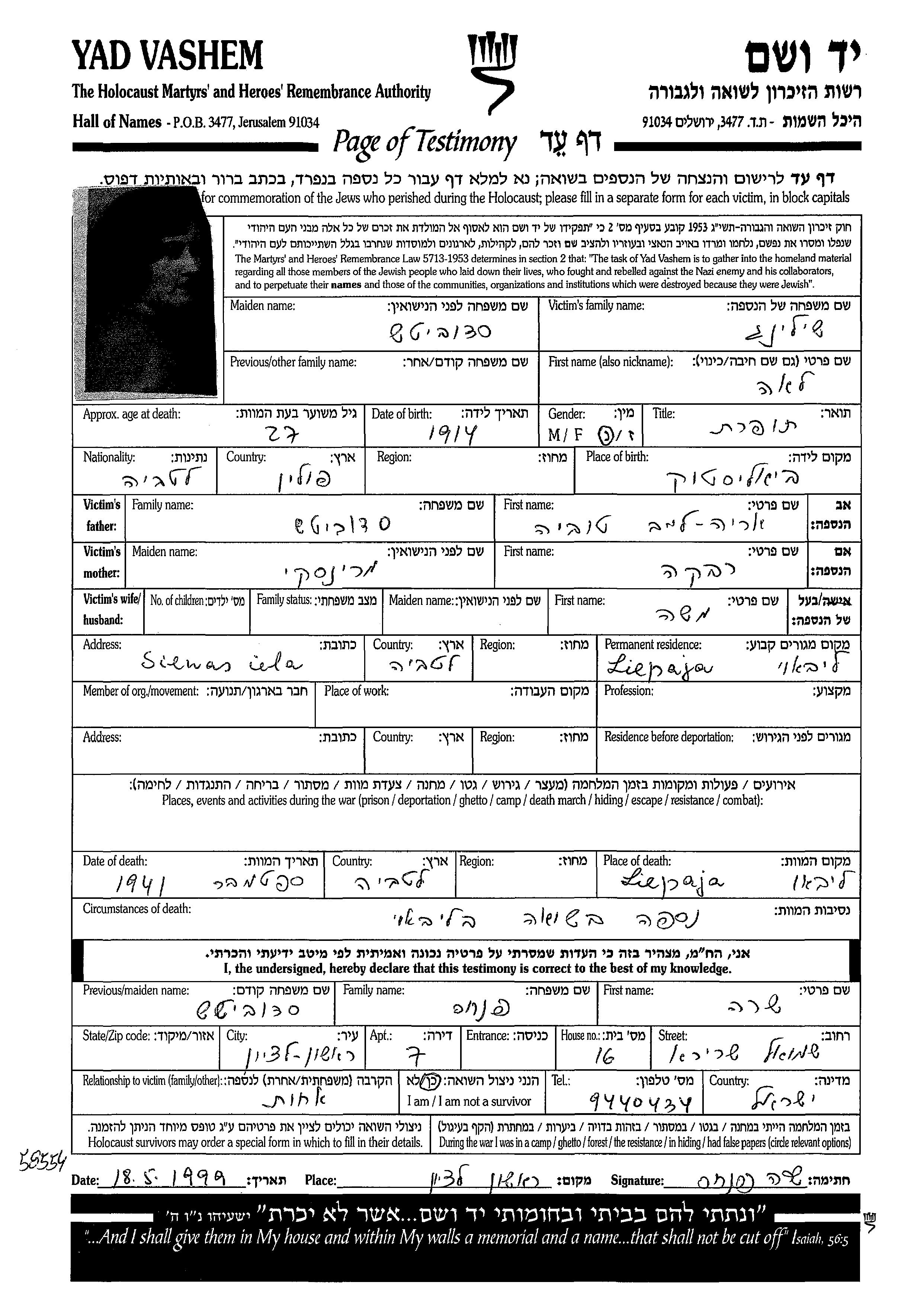 Яд Вашем - Листы свидетельских показаний Мемориального фонда