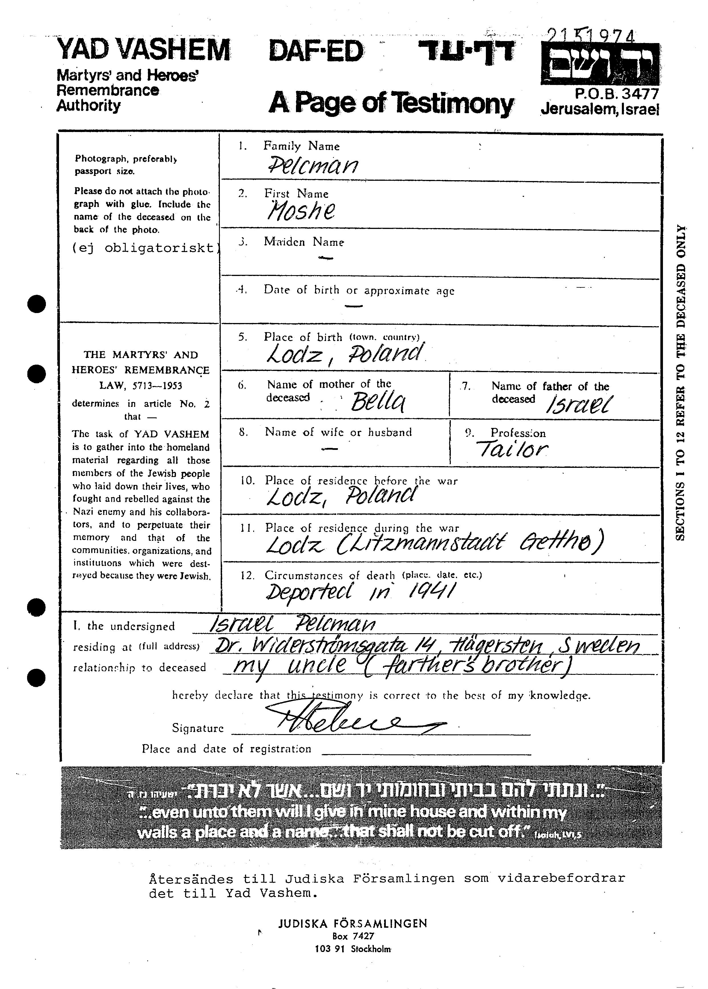 Моше Пельцман, место рождения: Лодзь, Польша. Отец: Исраэль, mать:Белла. Портной / портниха. Место жительства до войны: Лодзь, Польша. Место во время войны: Лицманштадт, Польша.