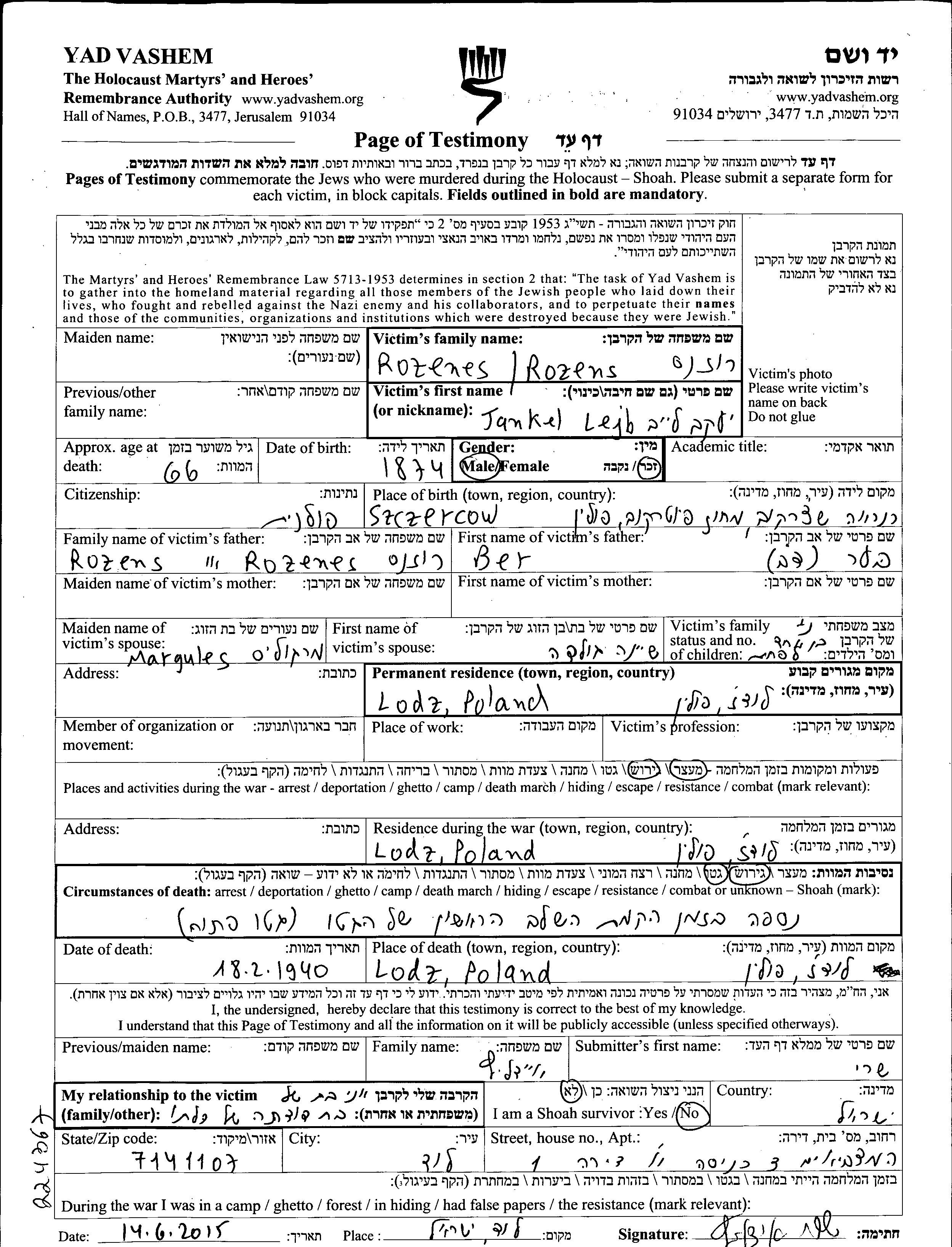Янкель Лейб Розенес, место рождения: Щерцув, Польша. Отец: Бер Дов. Женат / замужем. Место жительства до войны: Лодзь, Польша. Место во время войны: Лодзь, Польша.