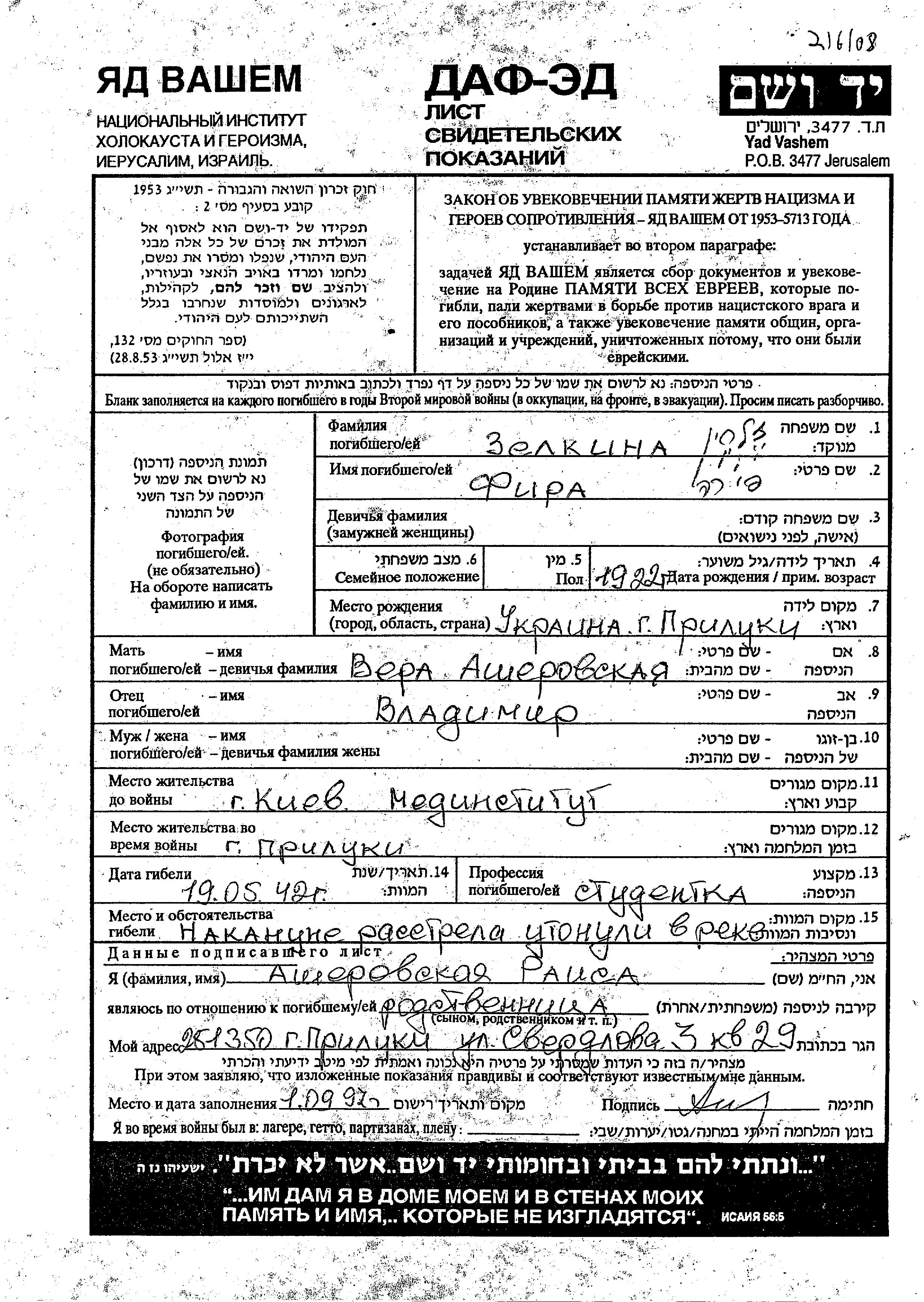 Фира Зелькин, место рождения: Прилуки, Украина (СССР). Отец: Владимир, mать:Вера, девичья фамилия Ашеровский. Студент / студентка. Место жительства до войны: Киев, Украина (СССР). Место во время войны: Прилуки, Украина (СССР).