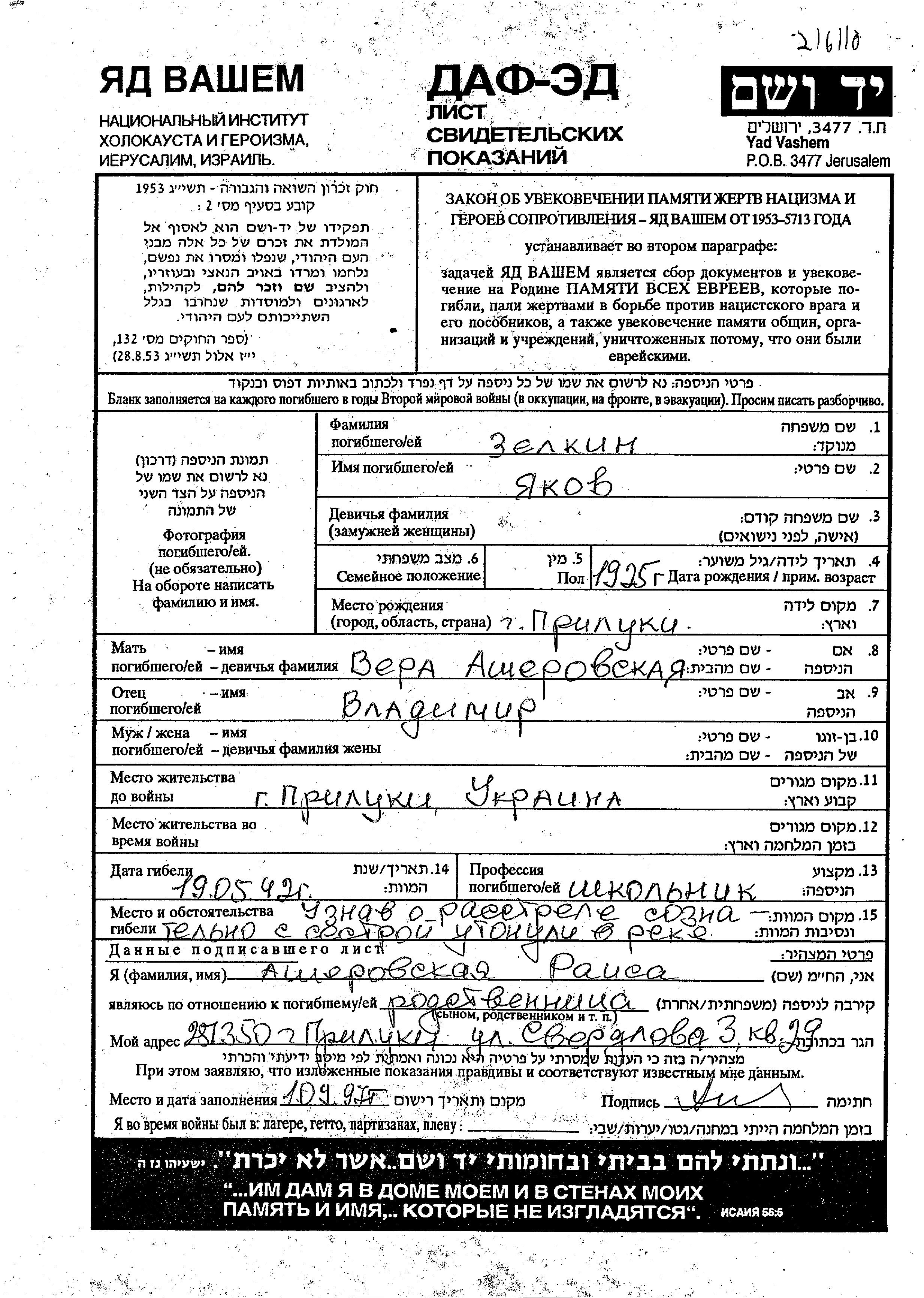 Зелькин Яков 1925 Прилуки, Украина (СССР) Лист свидетельских показаний