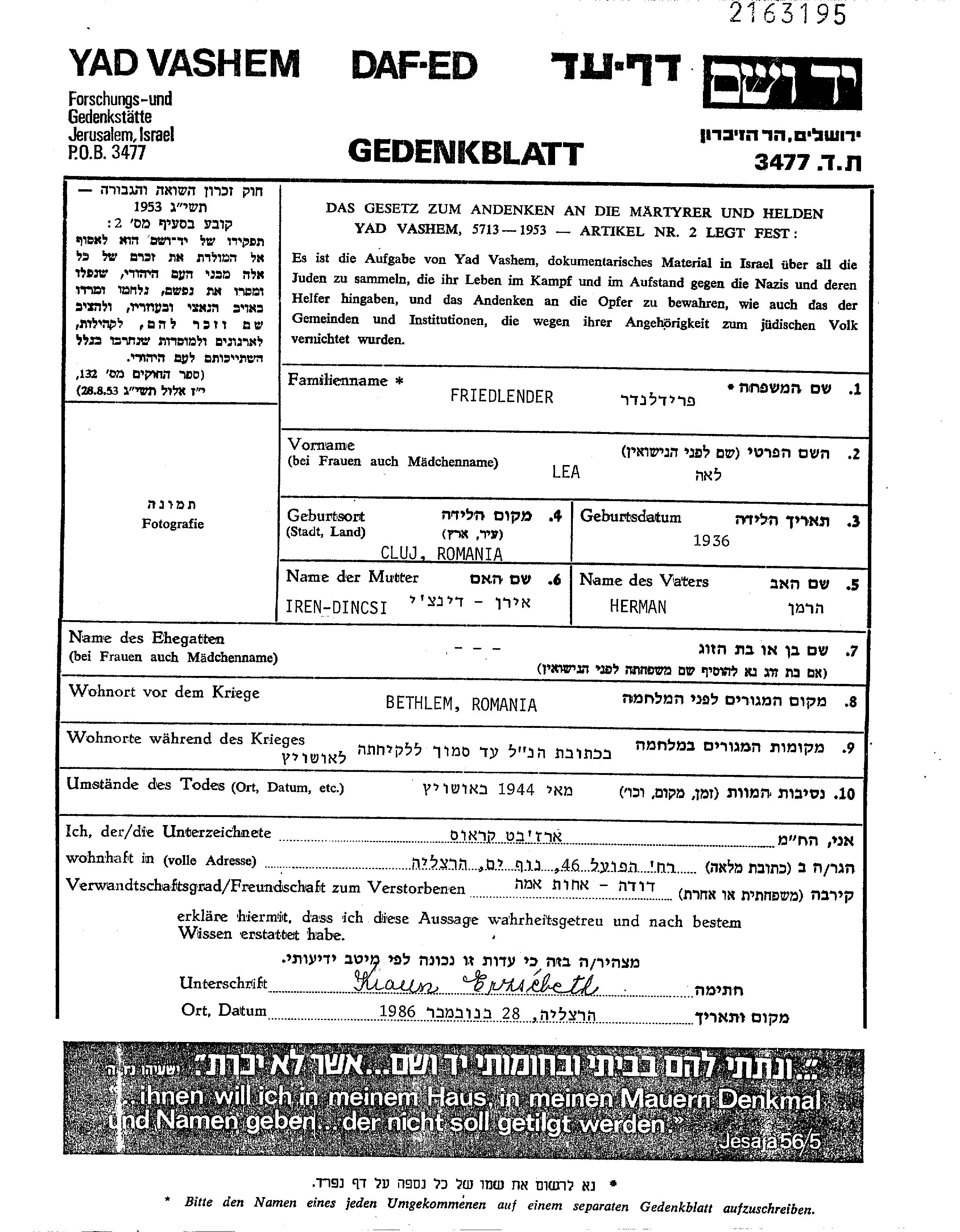 Лея Фридлендер, место рождения: Клуж, Румыния. Отец: Херман, mать:Динчи Ирен, девичья фамилия Краус. Ребенок. Место жительства до войны: Бетлен, Румыния. Место во время войны: Бетлен, Румыния.