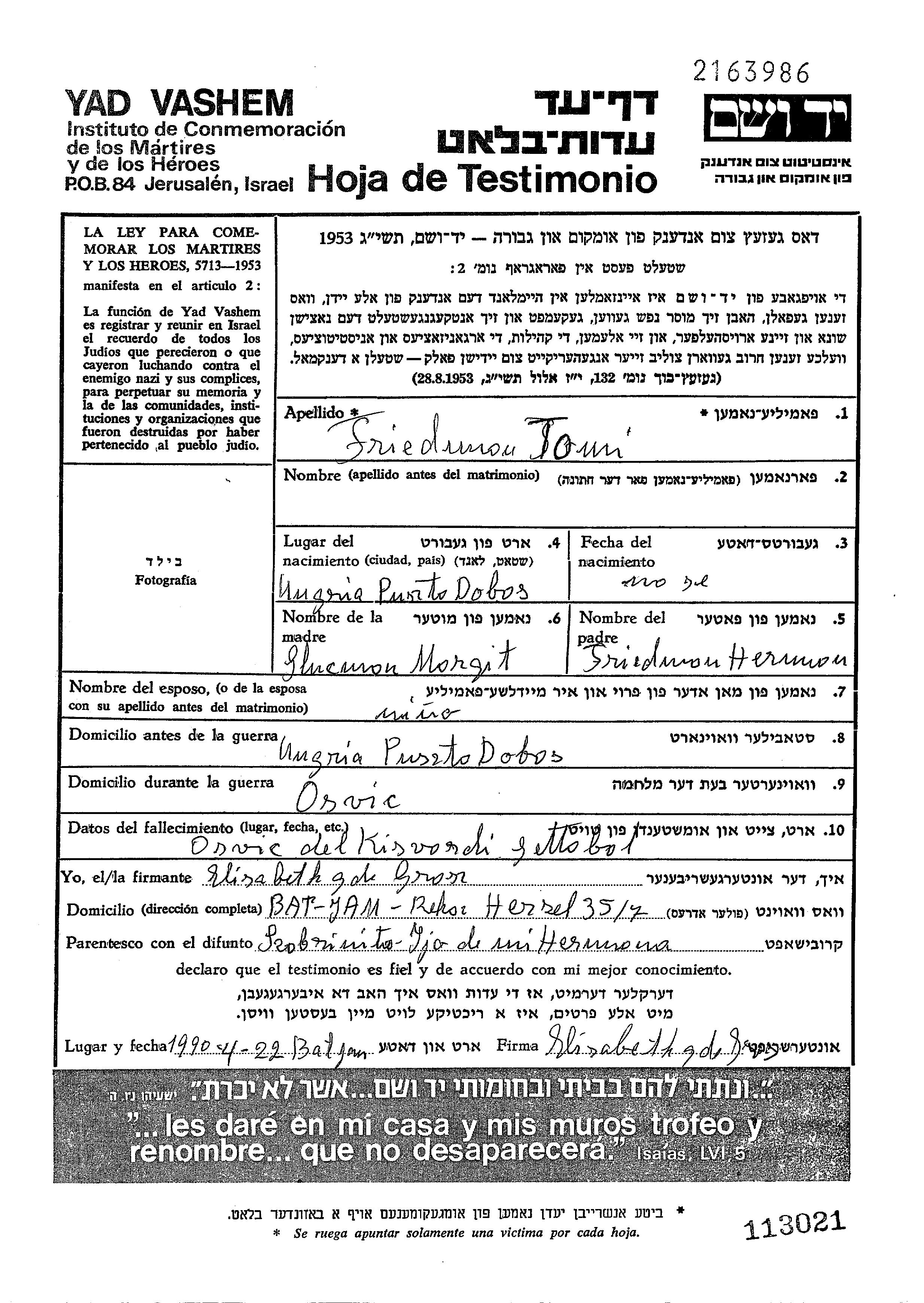 Тони Фридман, место рождения: Пустадобош, Венгрия. Отец: Херман, mать:Маргит, девичья фамилия Глюкман. Место жительства до войны: Пустадобош, Венгрия. Место во время войны: Кишварда, Венгрия.
