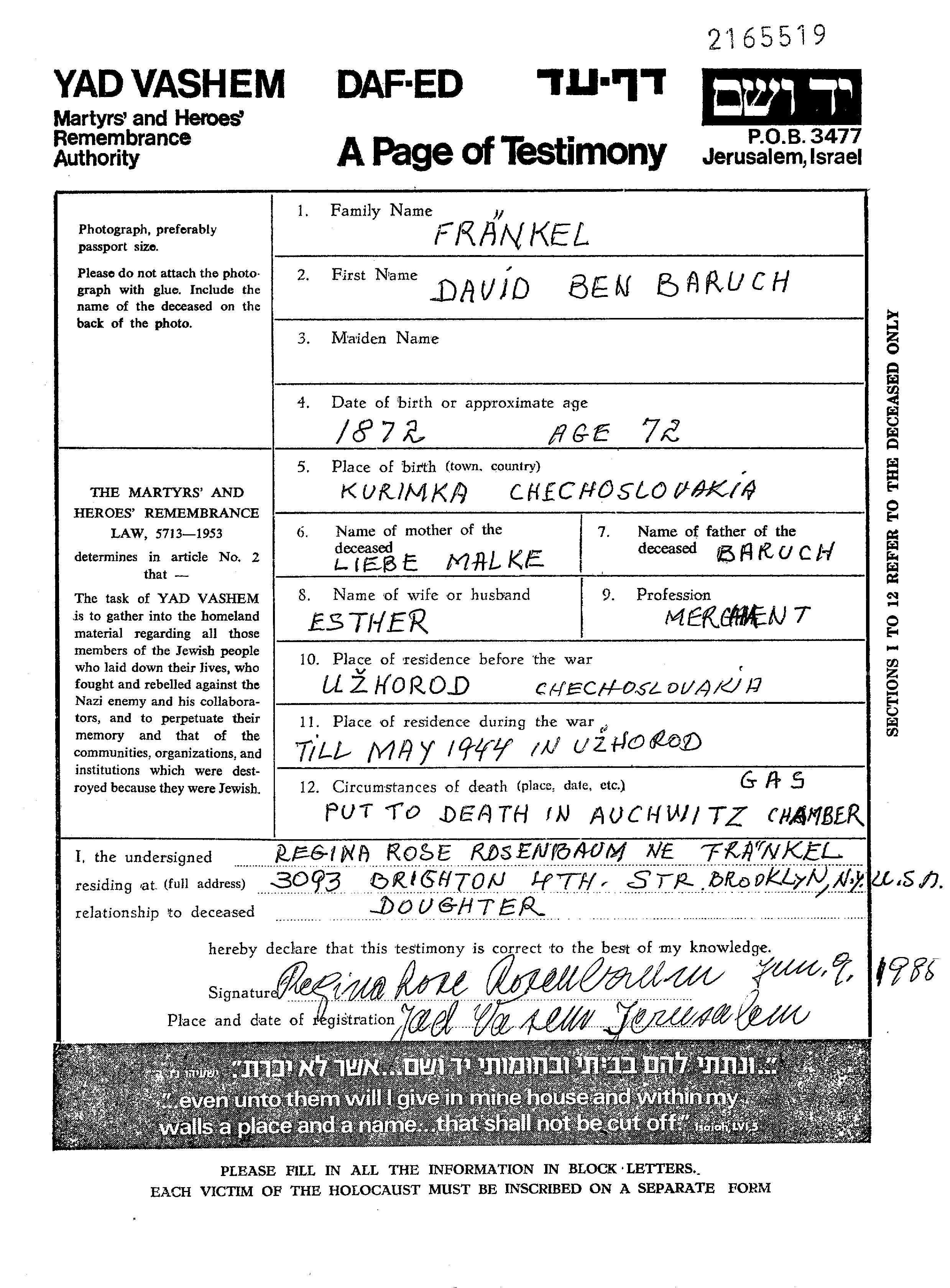 Давид Френкель, место рождения: Куримка, Чехословакия. Отец: Барух, mать:Либе Малке. Торговец / торговка. Женат / замужем. Место жительства до войны: Ужгород, Чехословакия. Место во время войны: Ужгород, Чехословакия.