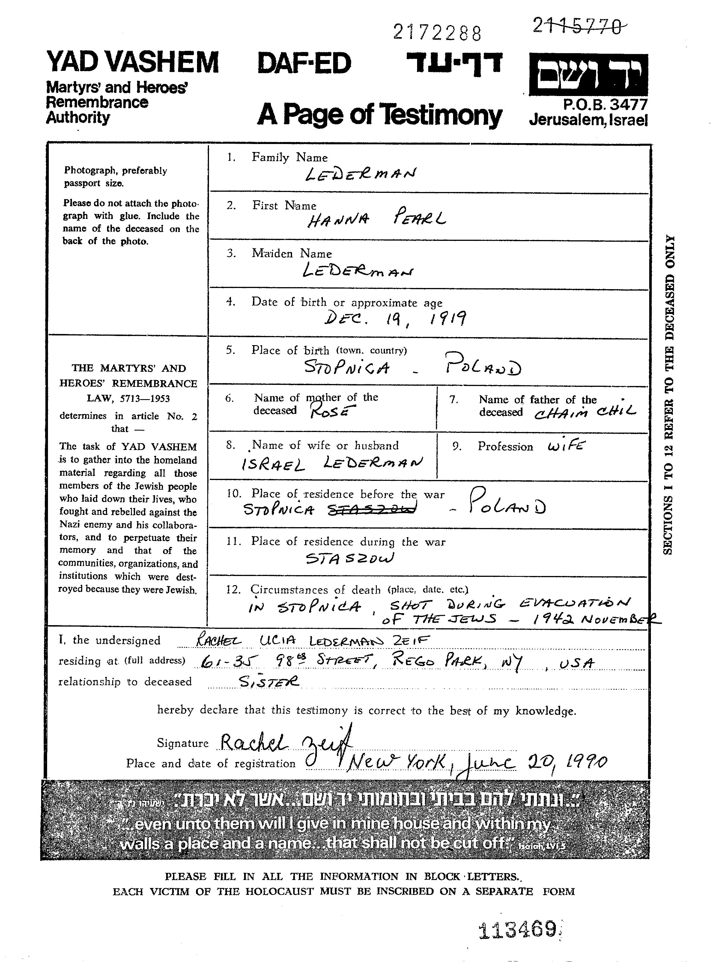 Ханна Перл Ледерман, место рождения: Стопница, Польша. Отец: Хаим Хиль, mать:Роза, девичья фамилия Цвейгенбаум. Домохозяйка. Женат / замужем. Место жительства до войны: Стопница, Польша. Место во время войны: Сташув, Польша.