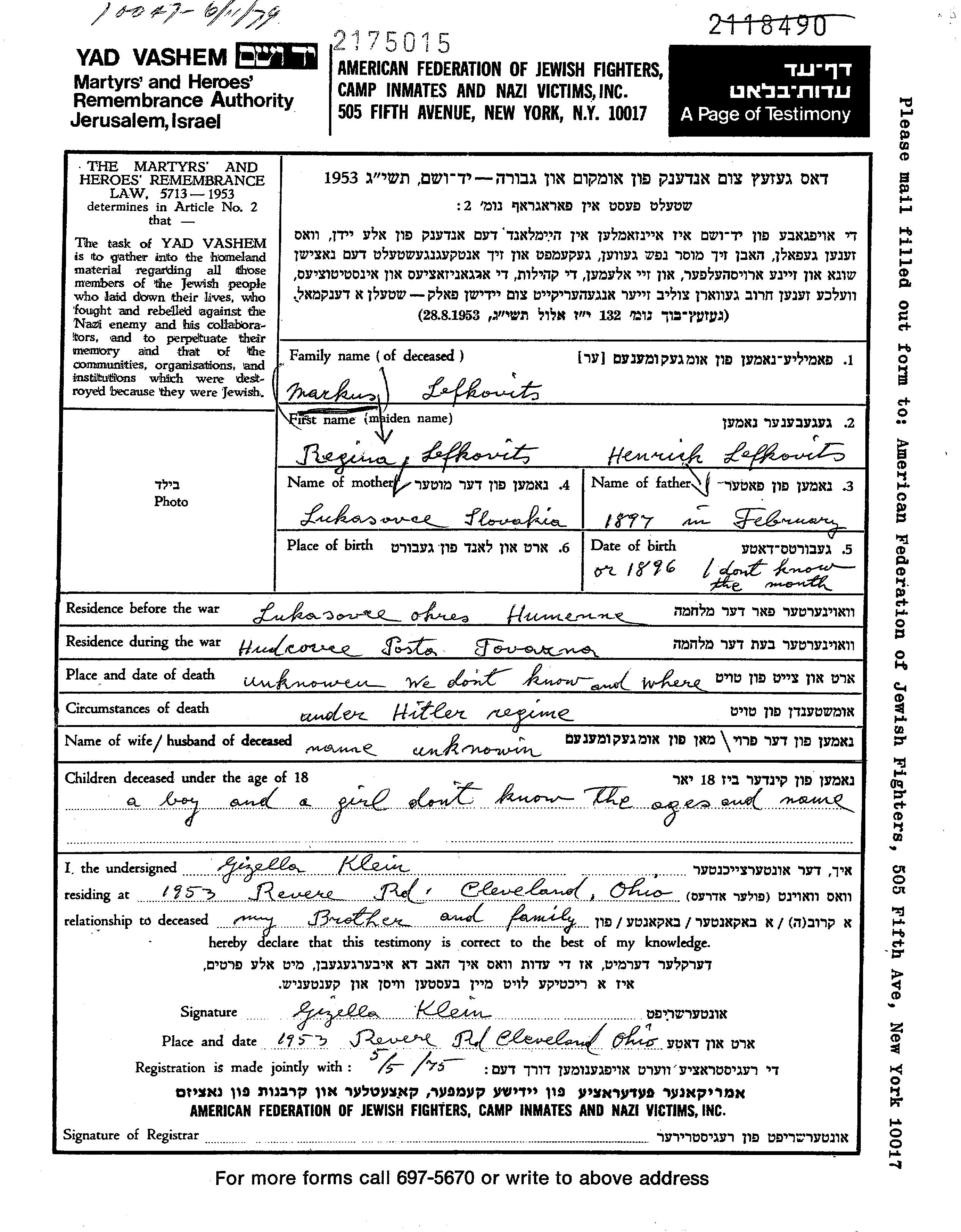 Маркус Лефковиц, место рождения: Лукачовце, Чехословакия. Отец: Хенрих, mать:Регина. Место жительства до войны: Лукачовце, Чехословакия. Место во время войны: Гудцовце, Чехословакия.