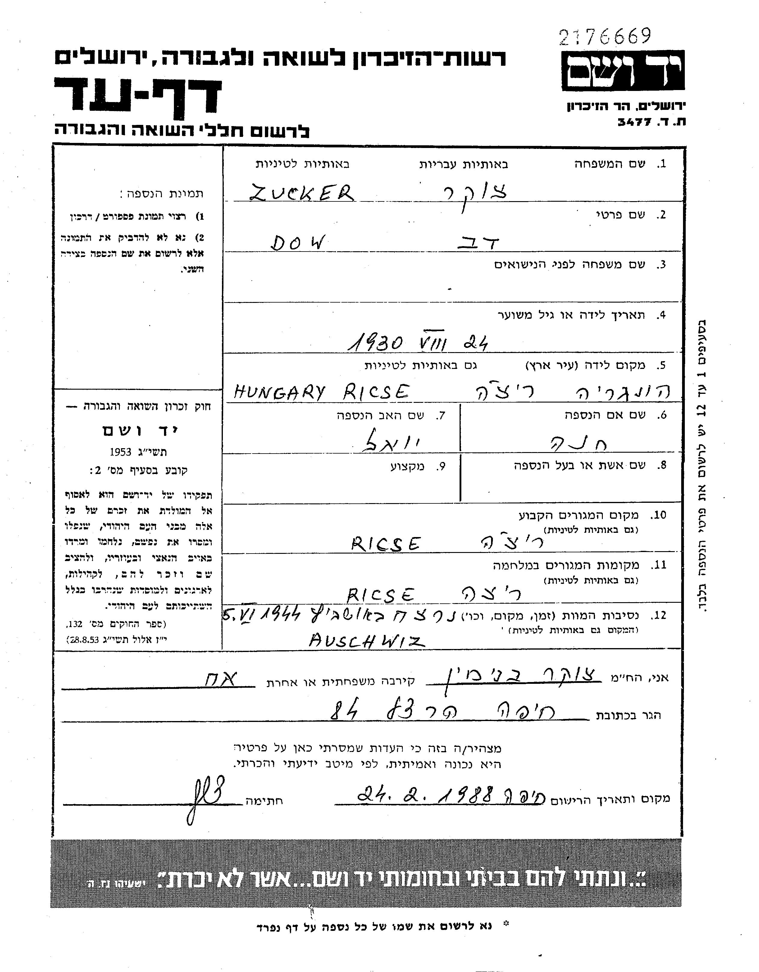 Цукер Дов 1930 Риче, Венгрия Лист свидетельских показаний