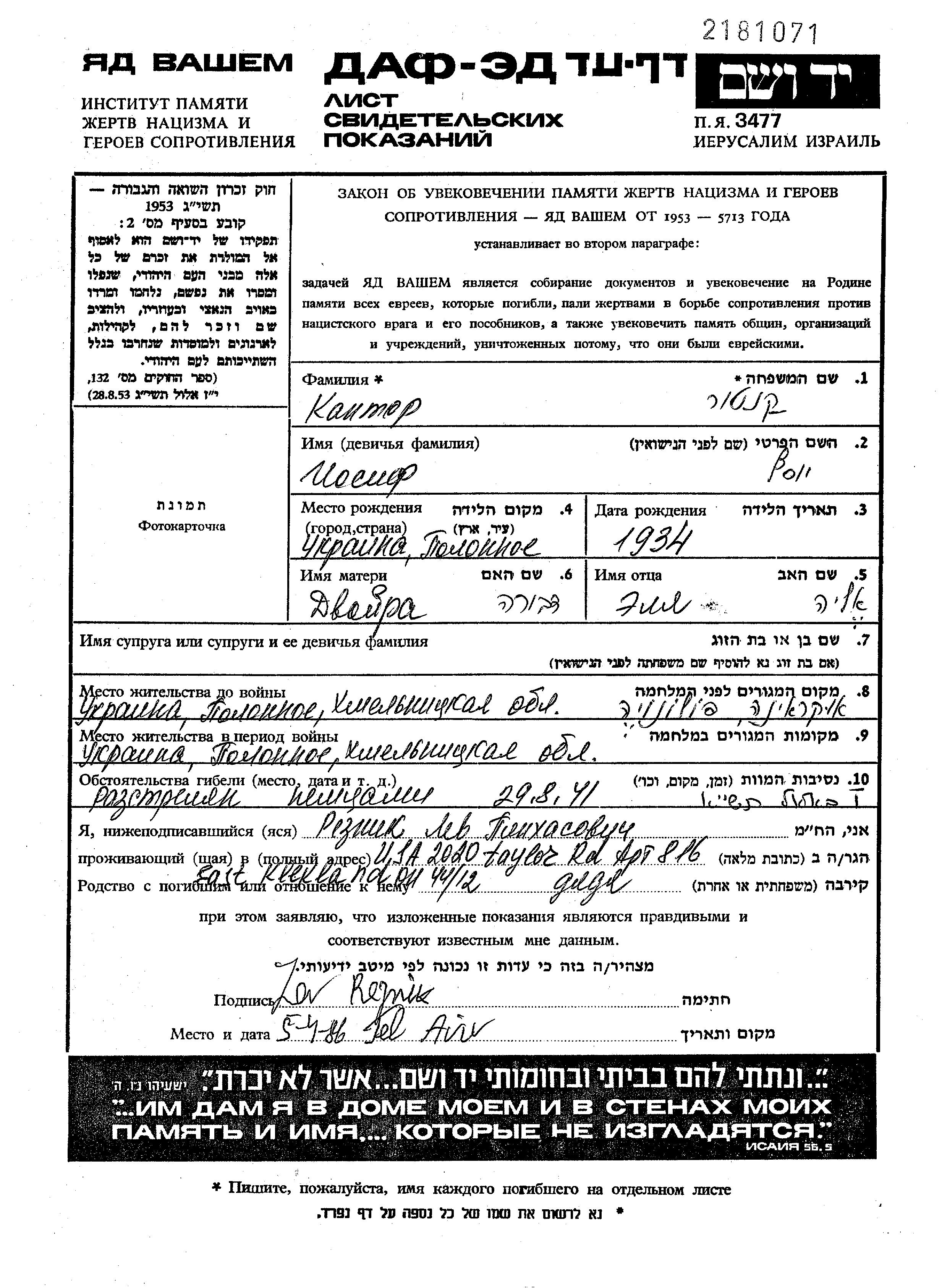 Кантор Иосиф 1934 Полонное, Украина (СССР) Лист свидетельских показаний