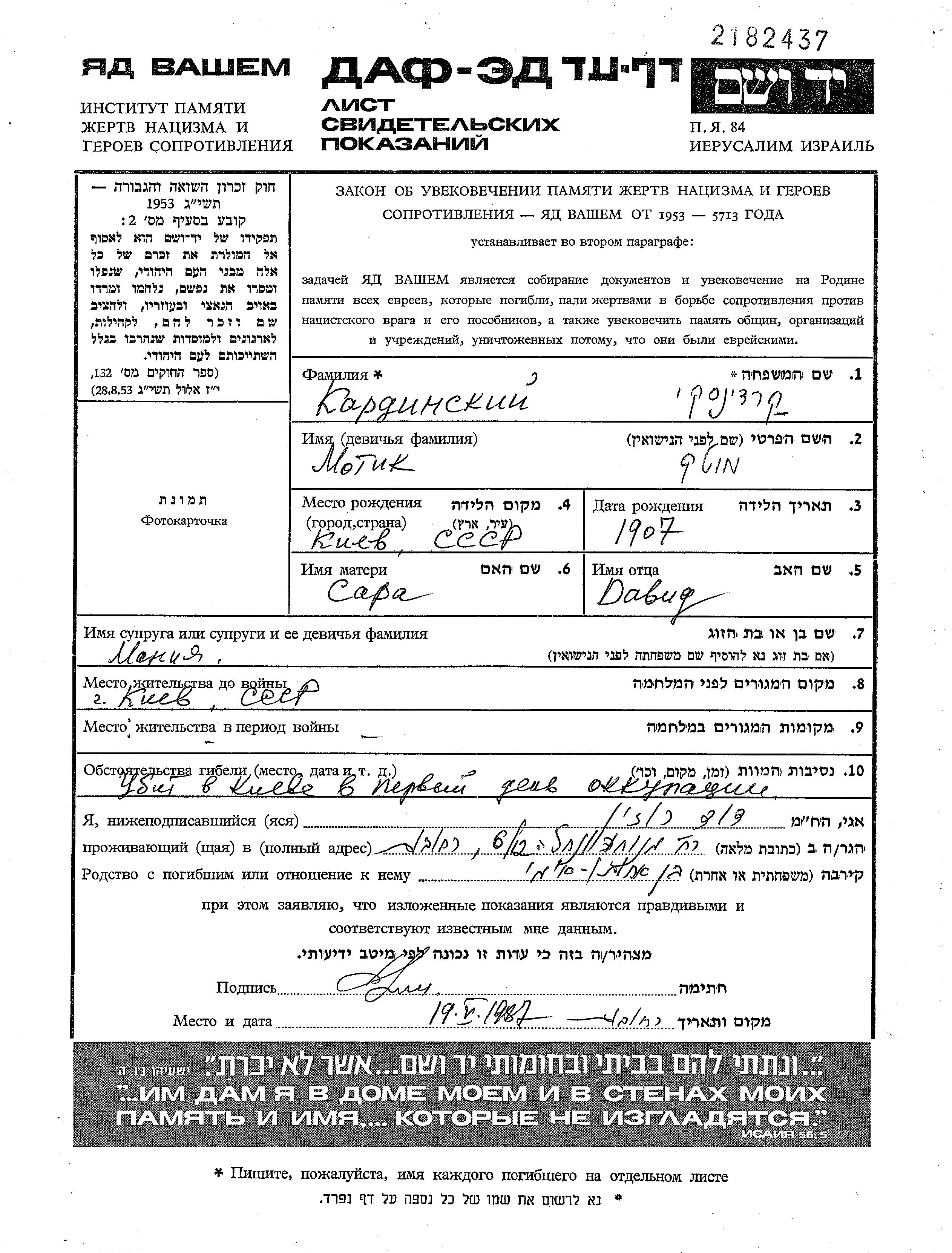 Мотик Кардинский, место рождения: Киев, Украина (СССР). Отец: Давид, mать:Сара. Женат / замужем. Место жительства до войны: Киев, Украина (СССР). Место во время войны: Киев, Украина (СССР).