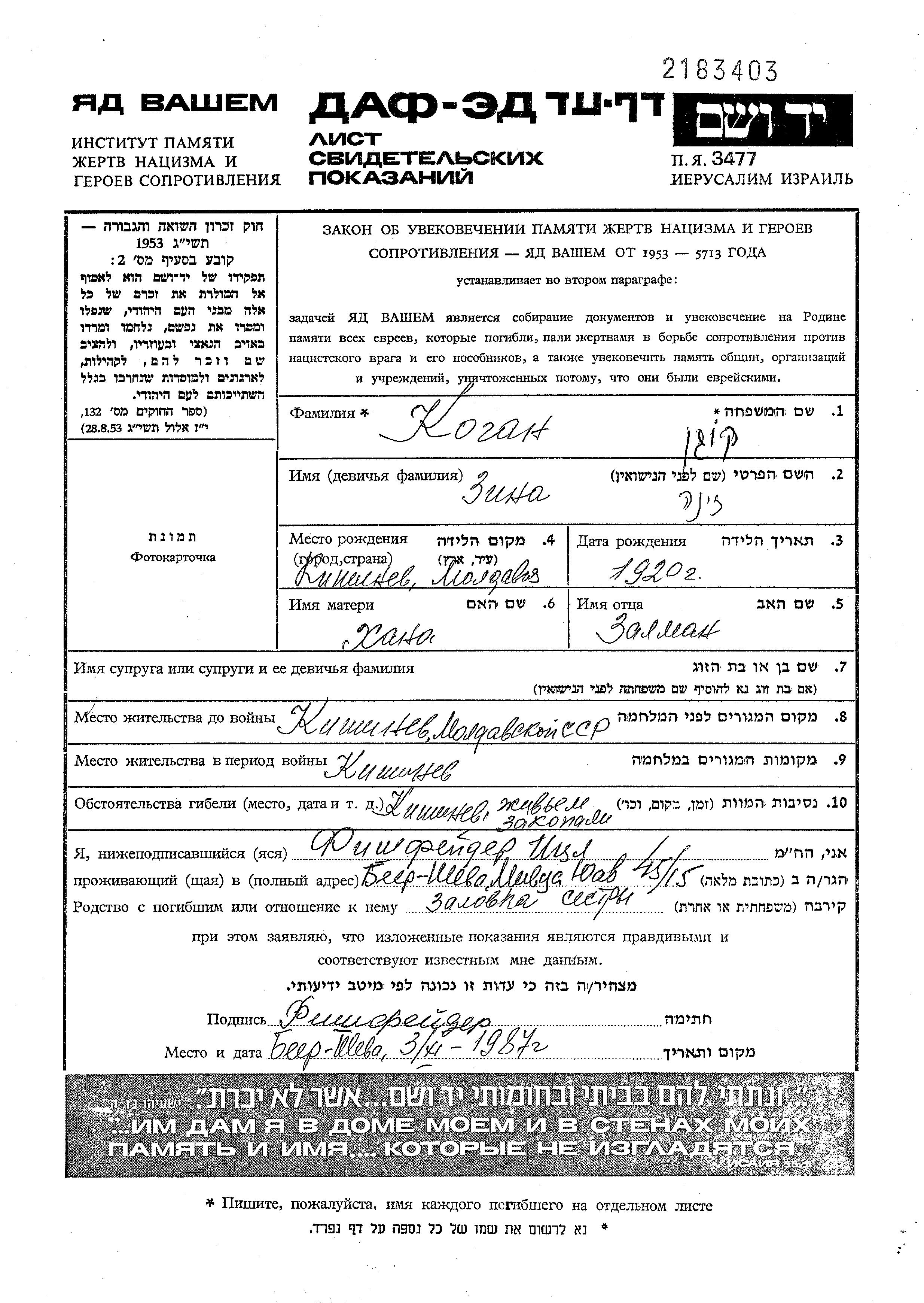 Коган Зина 1920 Кишинёв, Румыния Лист свидетельских показаний