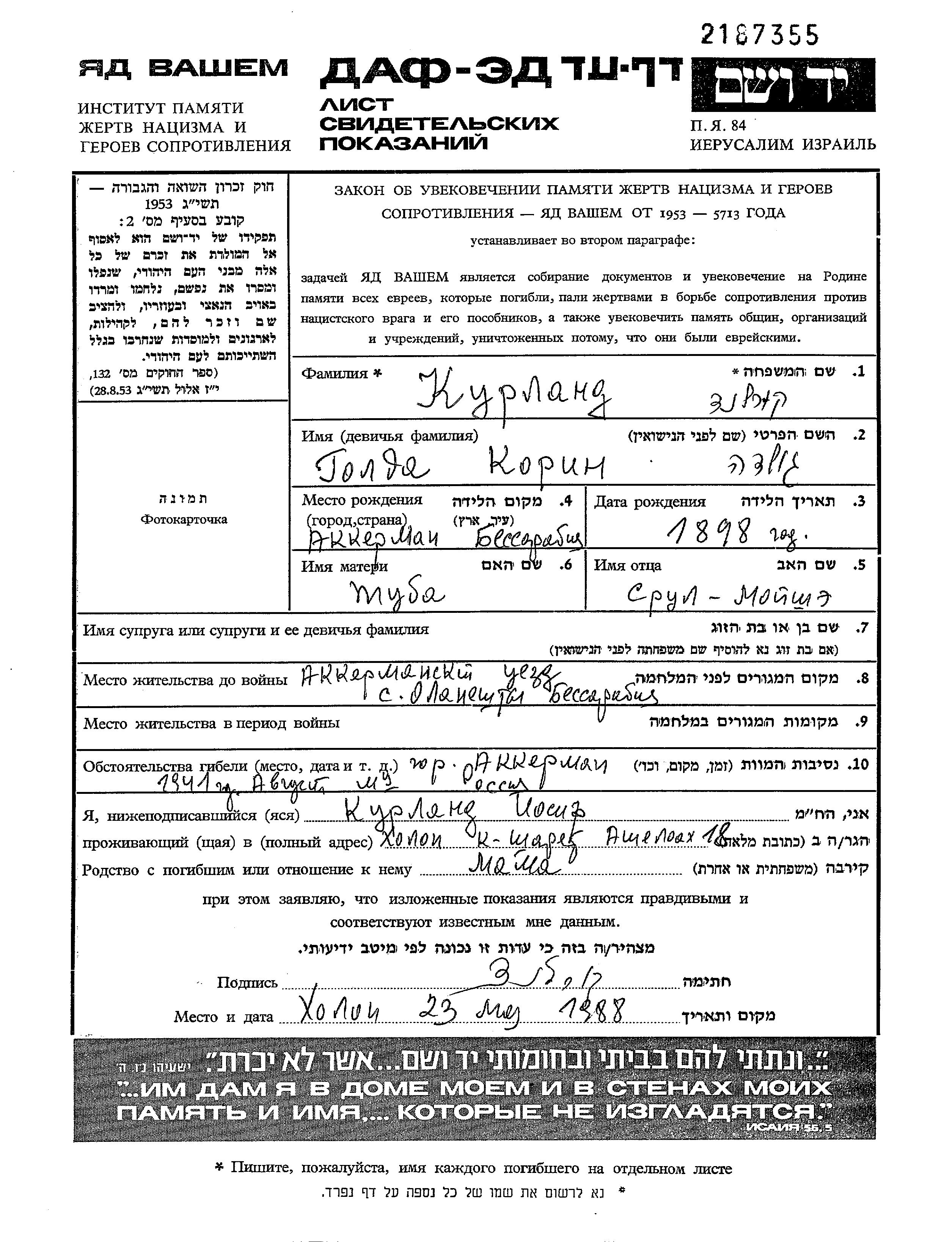 Яд Вашем - Листы свидетельских показаний Мемориального фонда