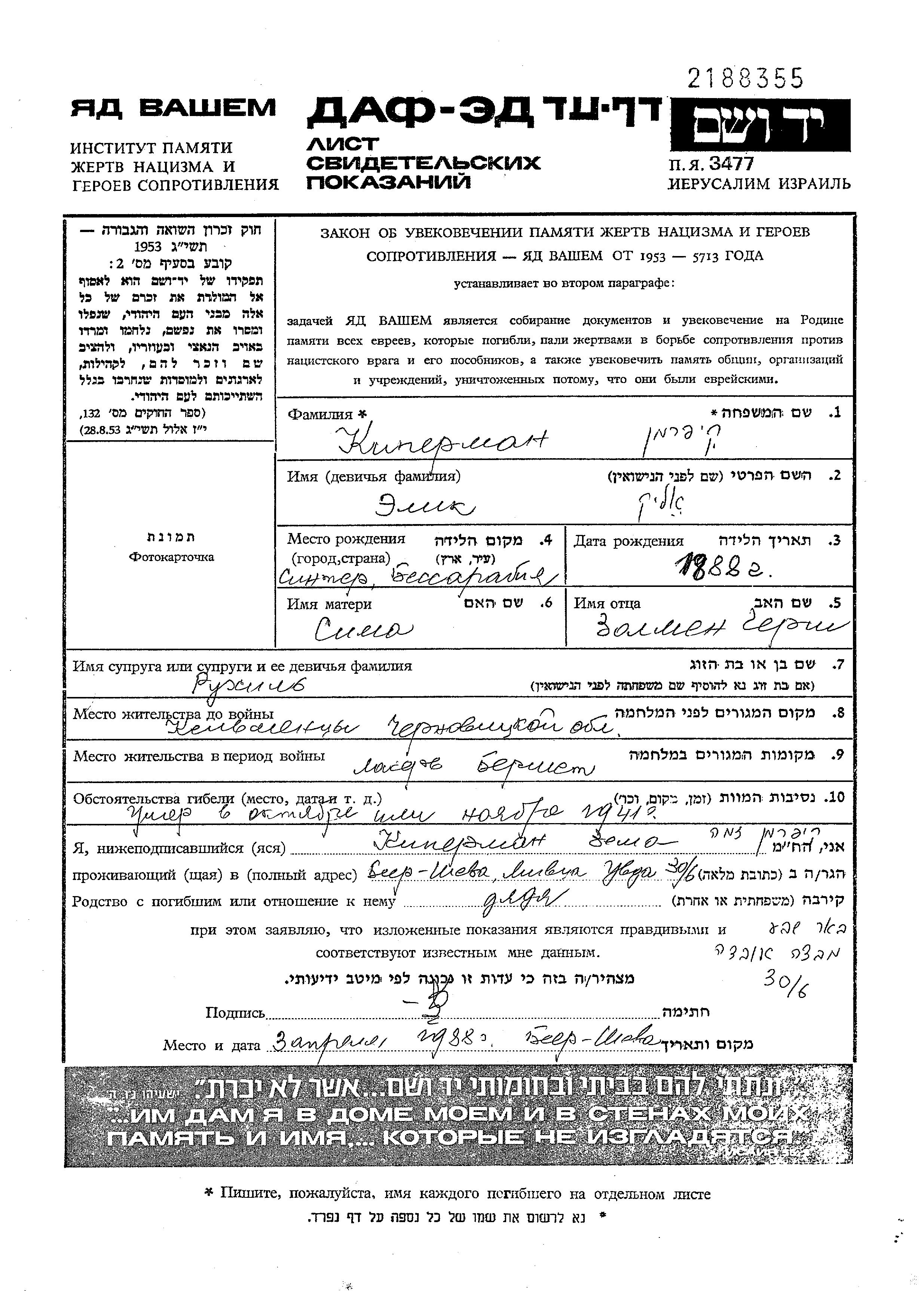 Киперман Алик Элик 1888 Келменицы, Румыния Лист свидетельских показаний