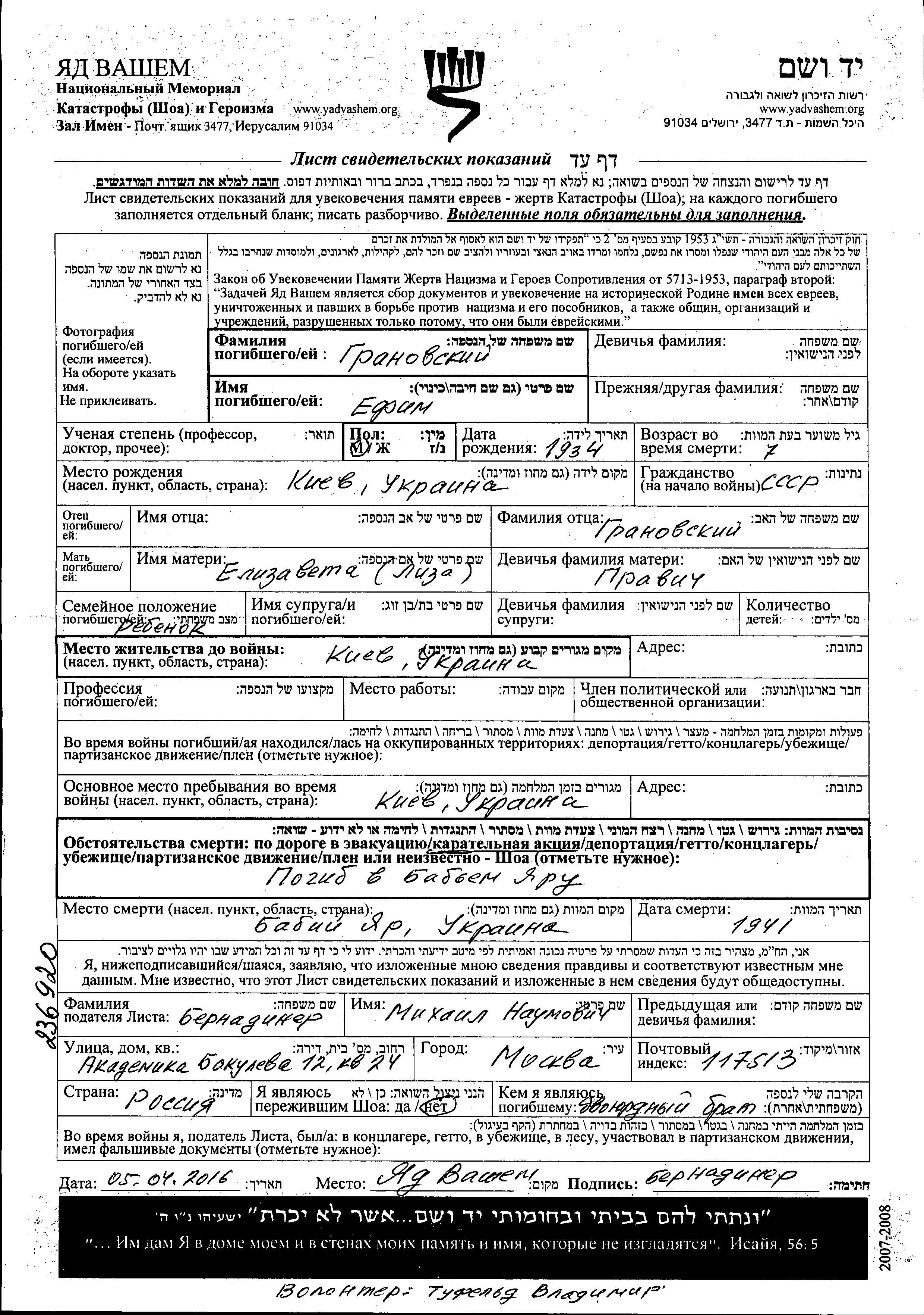Грановски Ефим 1934 Киев, Украина (СССР) Лист свидетельских показаний