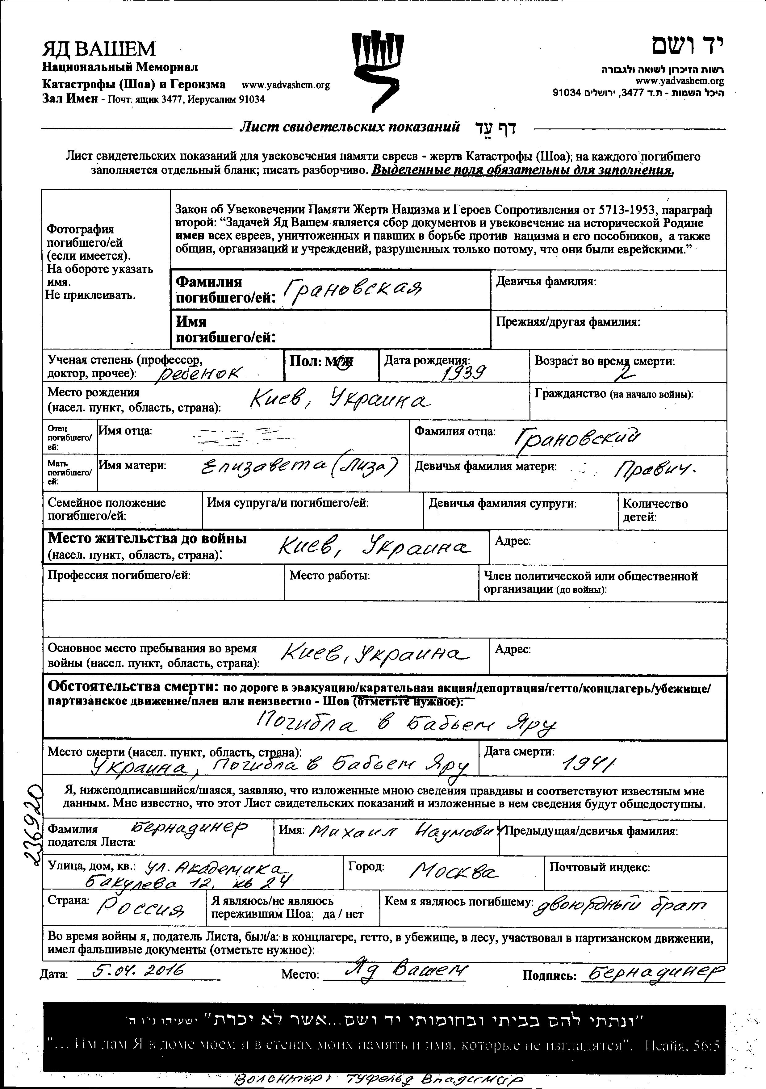 Грановская Имя неизвестно 1939 Киев, Украина (СССР) Лист свидетельских показаний