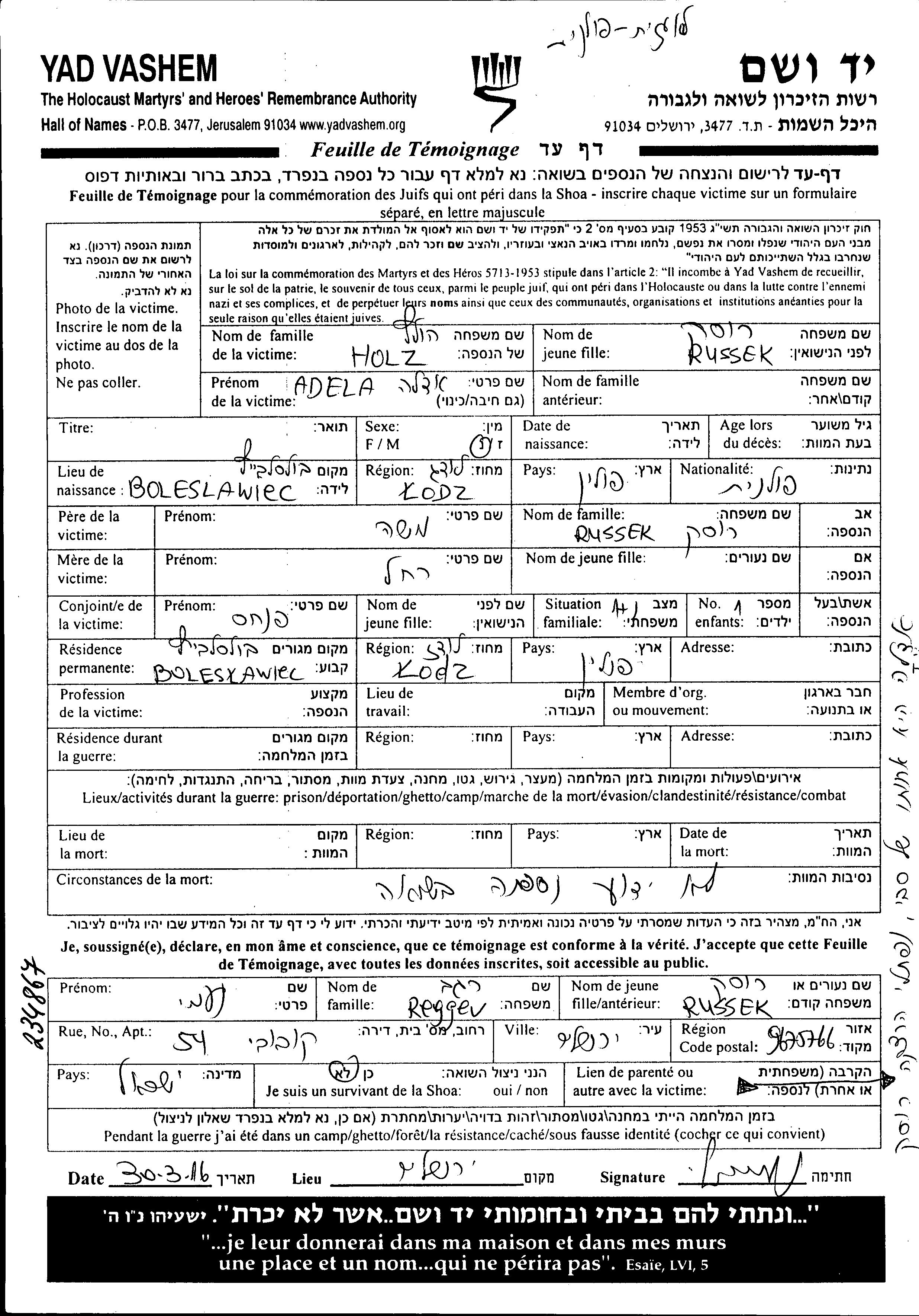 Адела Хольц, девичья фамилия Руссек, место рождения: Болеславец, Польша. Отец: Моше, mать:Рахель. Женат / замужем. Место жительства до войны: Болеславец, Польша.