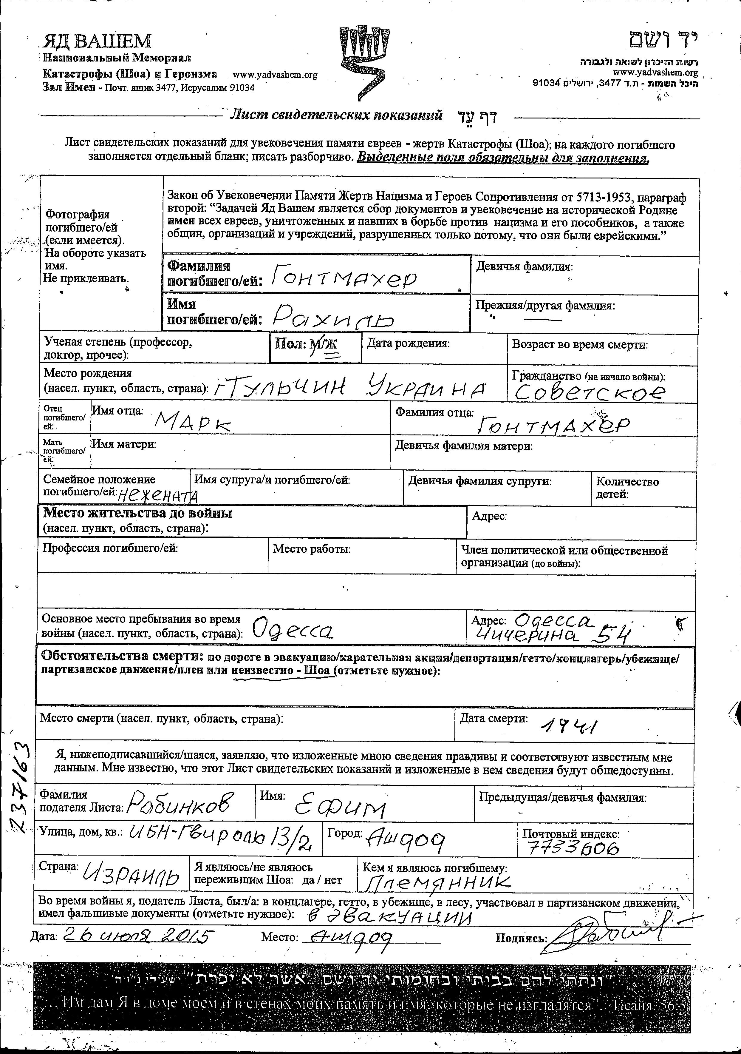Яд Вашем - Листы свидетельских показаний Мемориального фонда