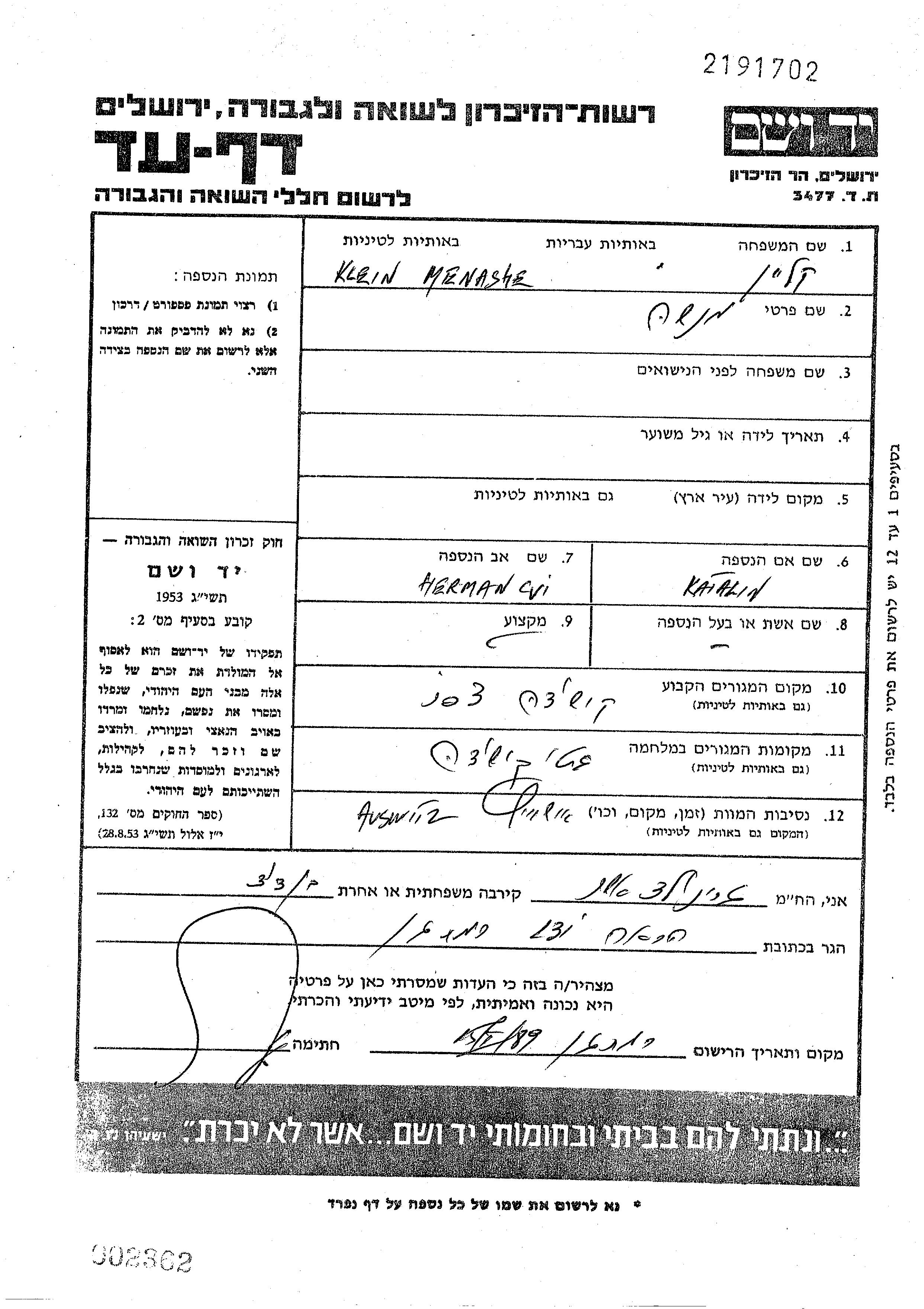 Клейн Менаше Кошице, Чехословакия Лист свидетельских показаний