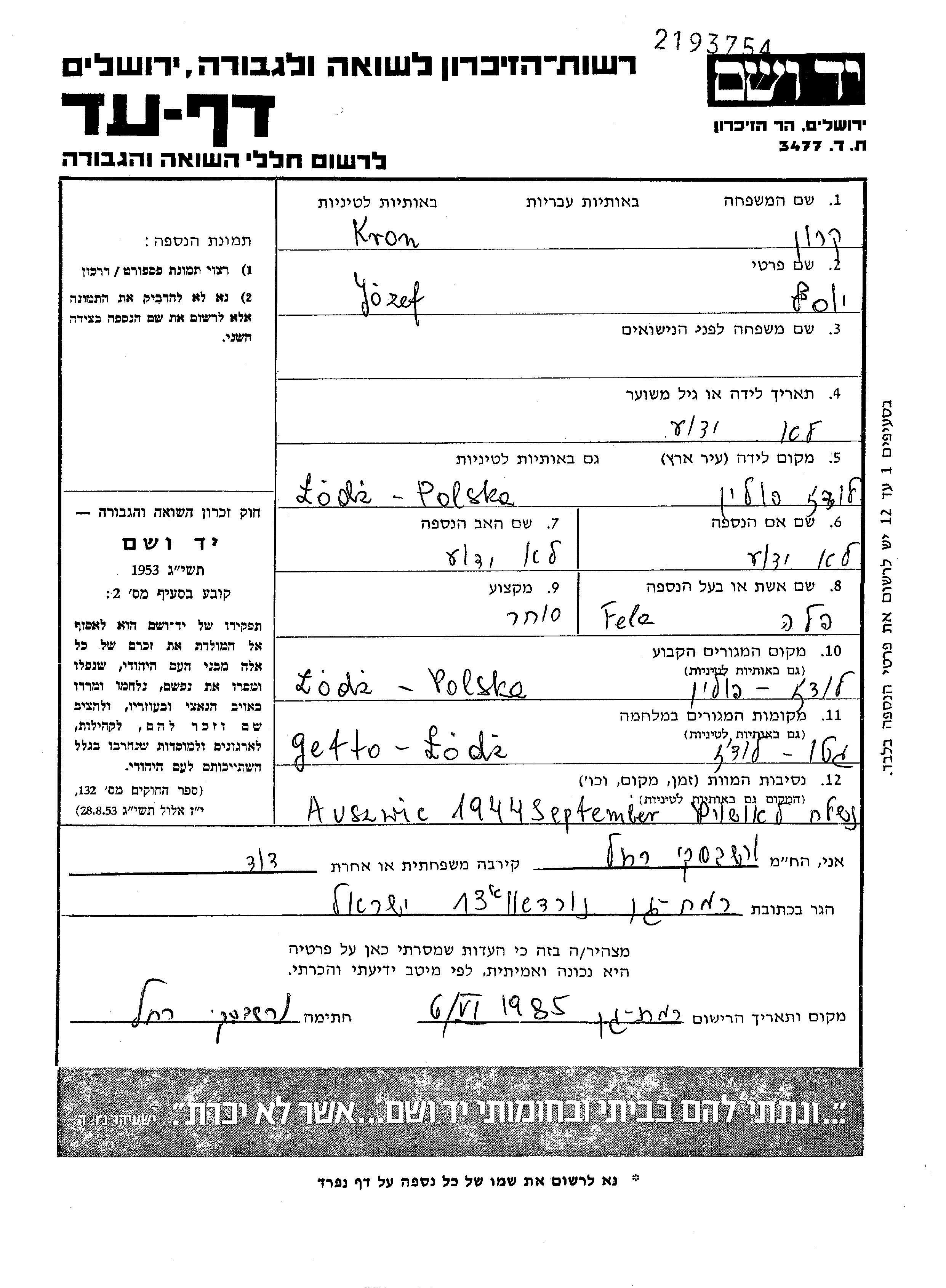 Крон Йозеф Лодзь, Польша Лист свидетельских показаний