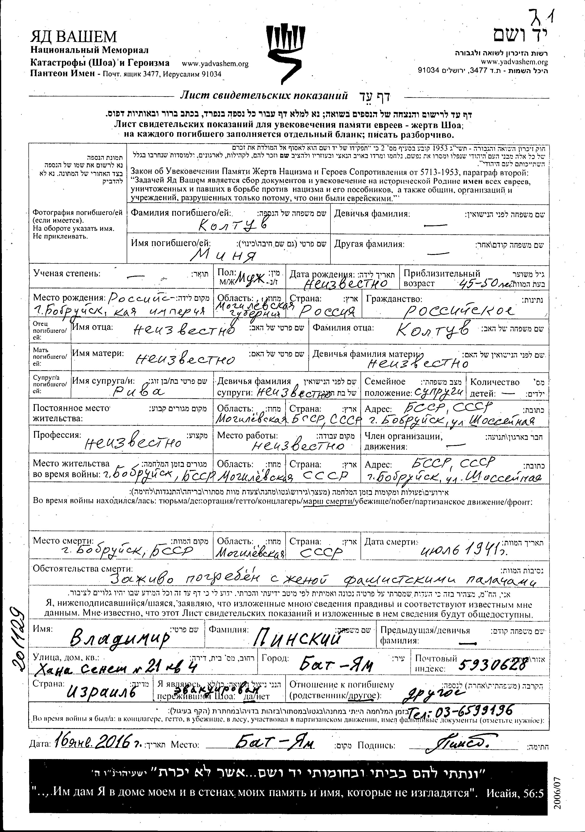 Колтув Миня Бобруйск, Белоруссия (СССР) Лист свидетельских показаний