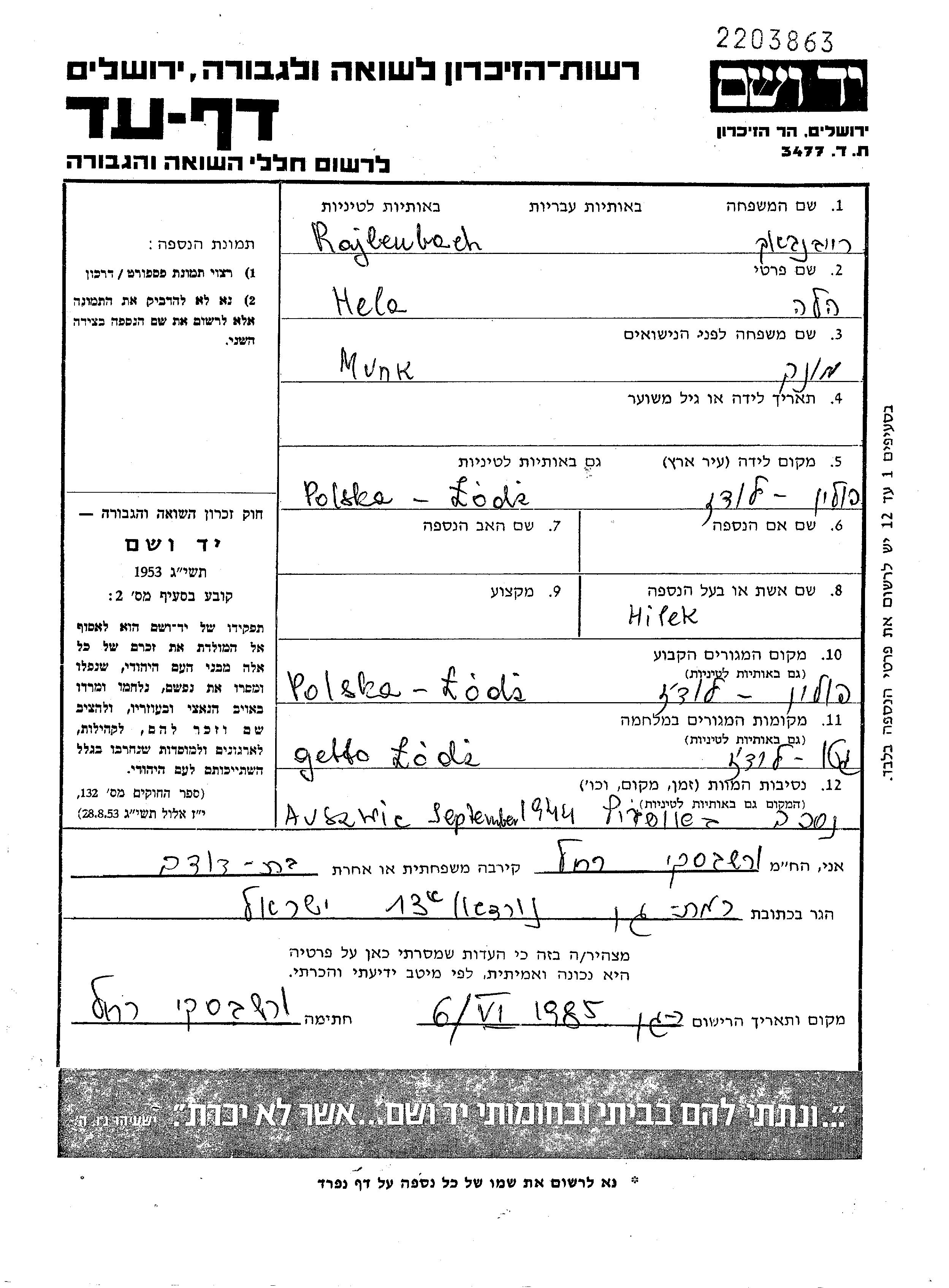 Райбенбах Хела Лодзь, Польша Лист свидетельских показаний