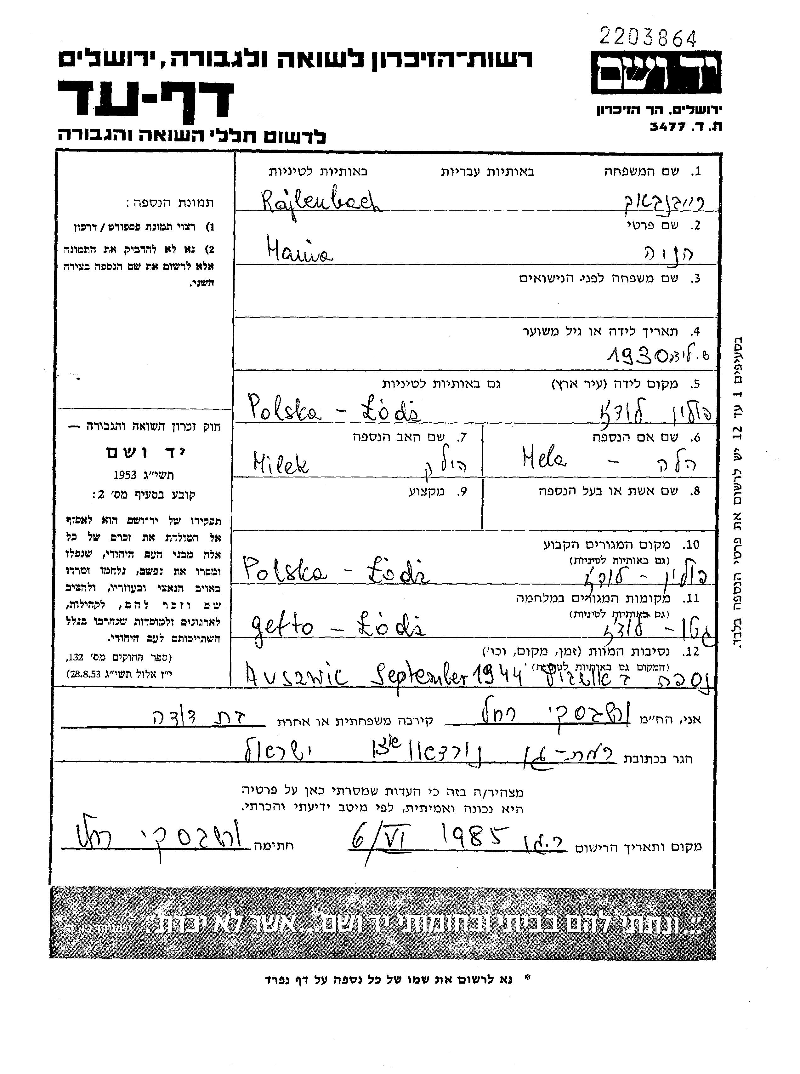 Ханя Хеня Райбенбах, место рождения: Лодзь, Польша. Отец: Хилек, mать:Хела, девичья фамилия Мунк. Ребенок. Место жительства до войны: Лодзь, Польша. Место во время войны: Лодзь, Польша.