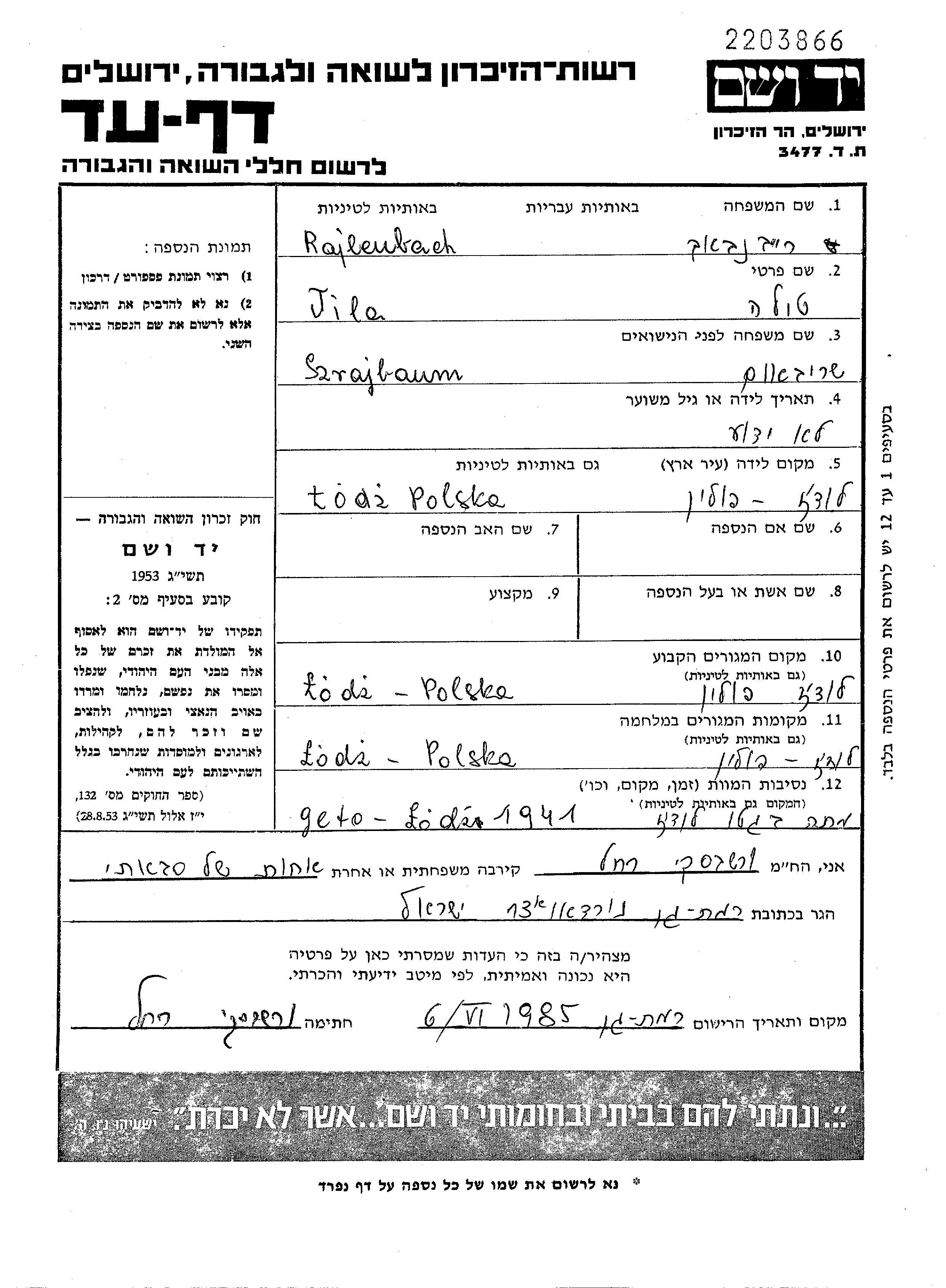 Райбенбах Тиля Лодзь, Польша Лист свидетельских показаний