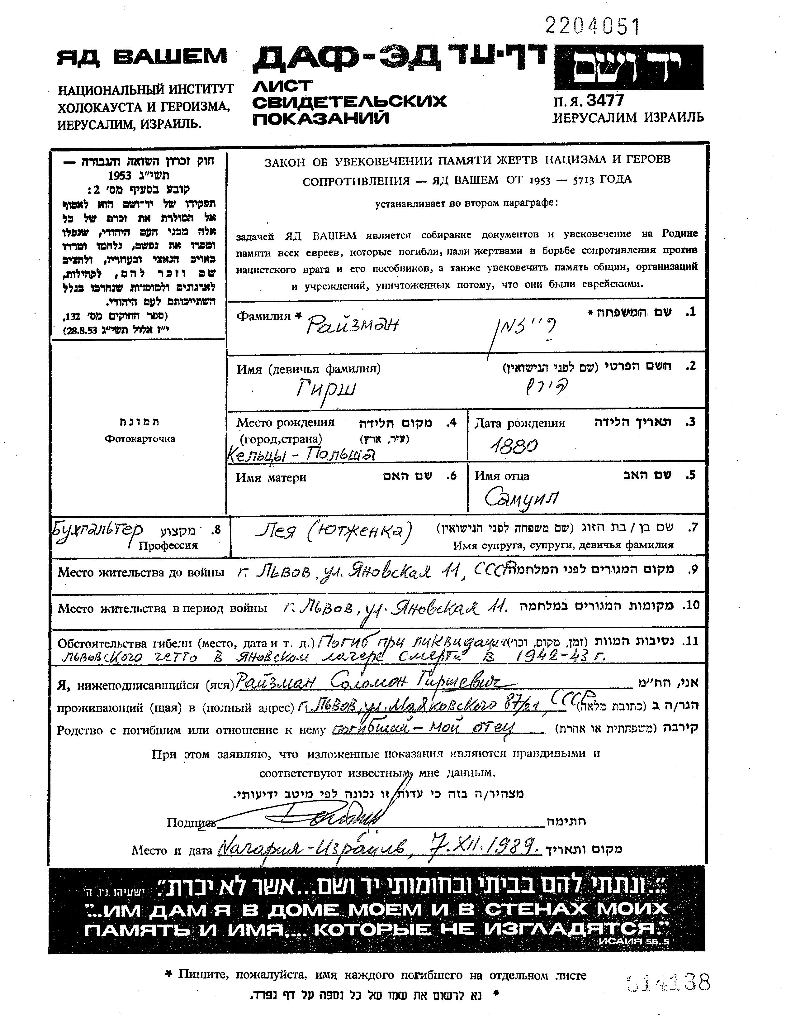 Гирш Райзман, место рождения: Кельце, Польша. Отец: Самуил. Бухгалтер / счетовод. Женат / замужем. Место жительства до войны: Львов, Польша. Место во время войны: Львов, Польша.